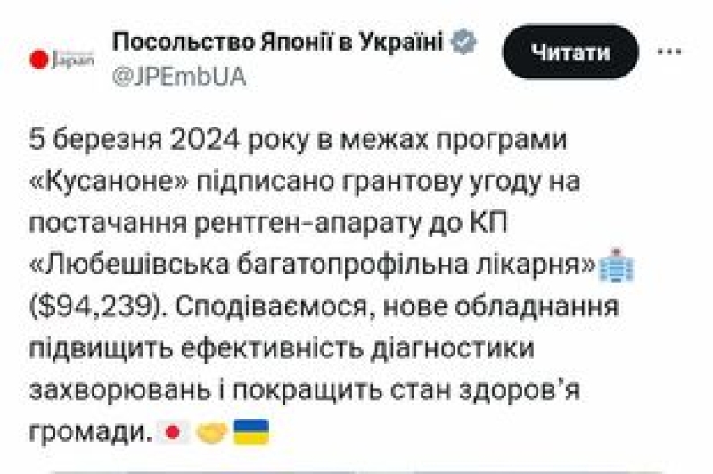 «5 березня 2024 року в межах програми «Кусаноне» підписали грантову угоду на постачання рентген-апарату до КП «Любешівська багатопрофільна лікарня» ($ 94,239). Сподіваємося, нове обладнання підвищить ефективність діагностики захворювань і покращить стан здоров’я громади», – йдеться у повідомленні.