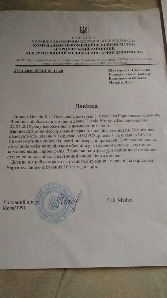 Батьки маленької Вікторії Павлік з села Скобелка Горохівського району просять допомогти зібрати кошти на лікування.