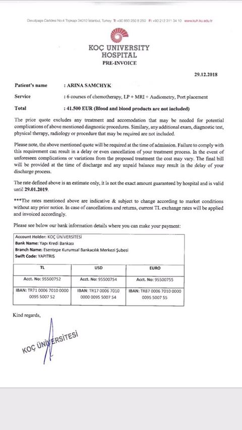 Турецька клініка “KOC UNIVERSITY HOSPITAL” виставила рахунок в сумі 41500 євро(сума може змінюватися в залежності від призначених додаткових аналізів або маніпуляцій, які можуть знадобитися в лікуванні. Вже вчора, 2 січня, почали робити додаткові обстеження, після чого приступають до першого блоку хіміотерапії.