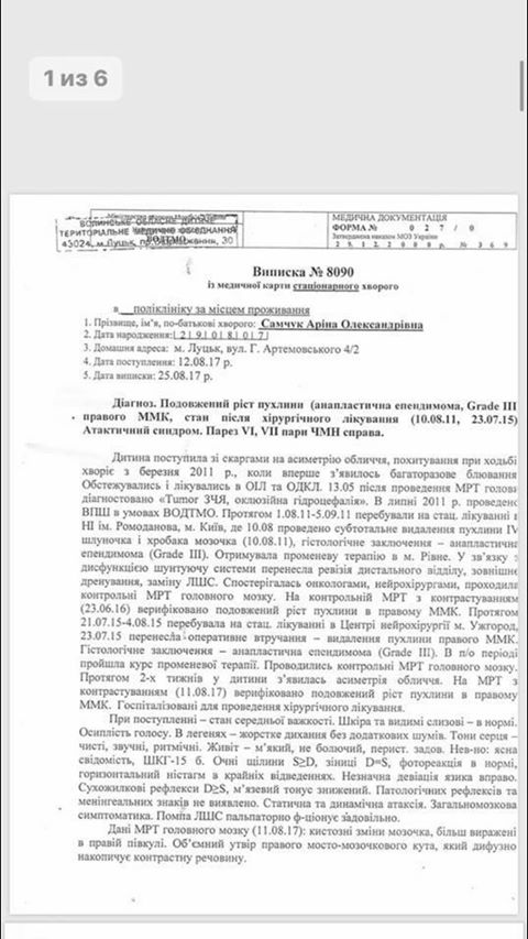 7 грудня 2018 року Аріна Самчук перенесла операцію з видалення пухлини. Видалити повністю пухлину не вдалося так, як залишок пухлини перебувє в стовпі головного мозку. Так як це вже був третій рецидив, потрібно подальше лікування. Основним його видом при цій пухлині є радіотерапія, але його вже пройшли дуже багато і подальше його застосування може бути небезпечним, тому потрібно робити хіміотерапію.