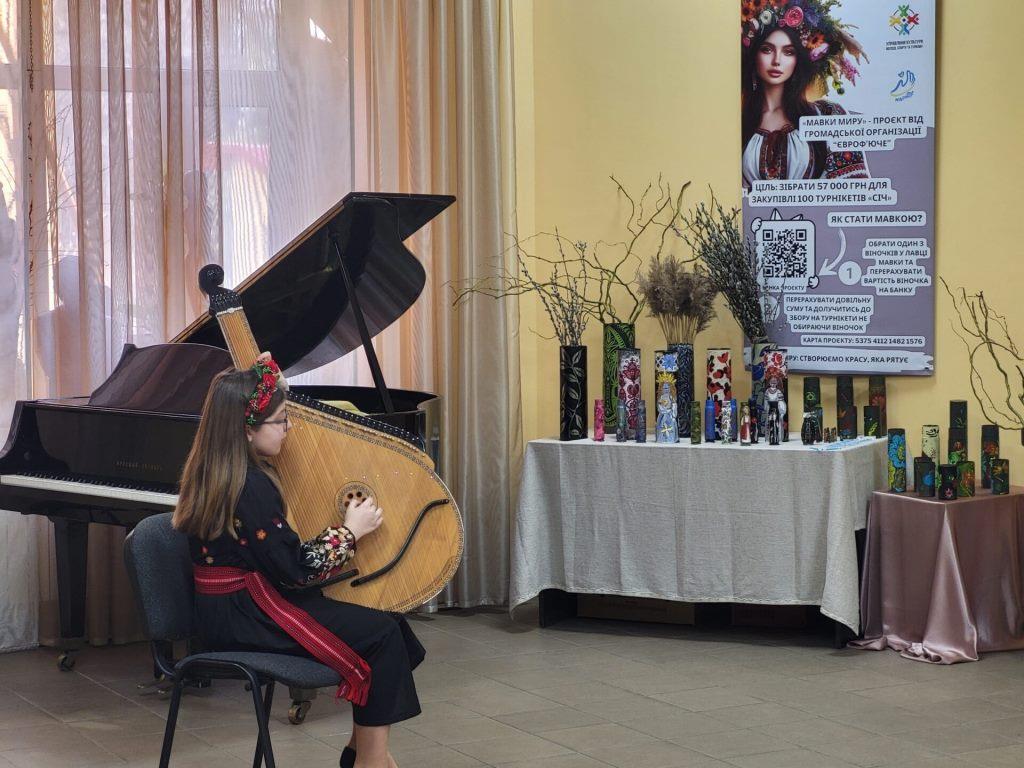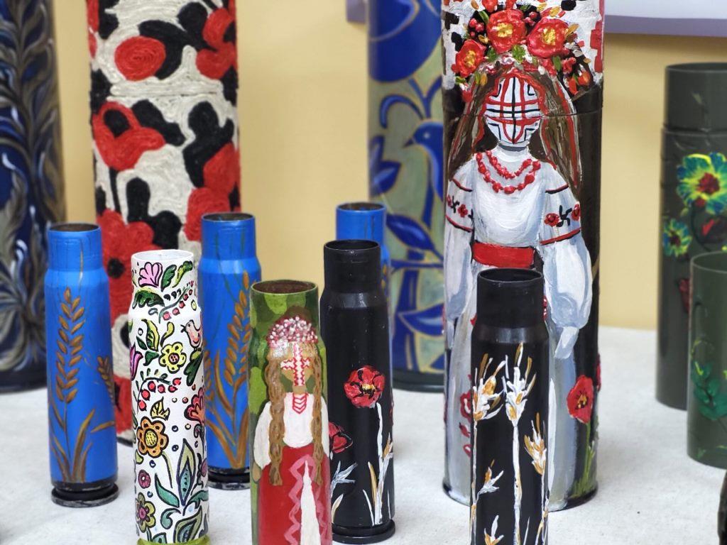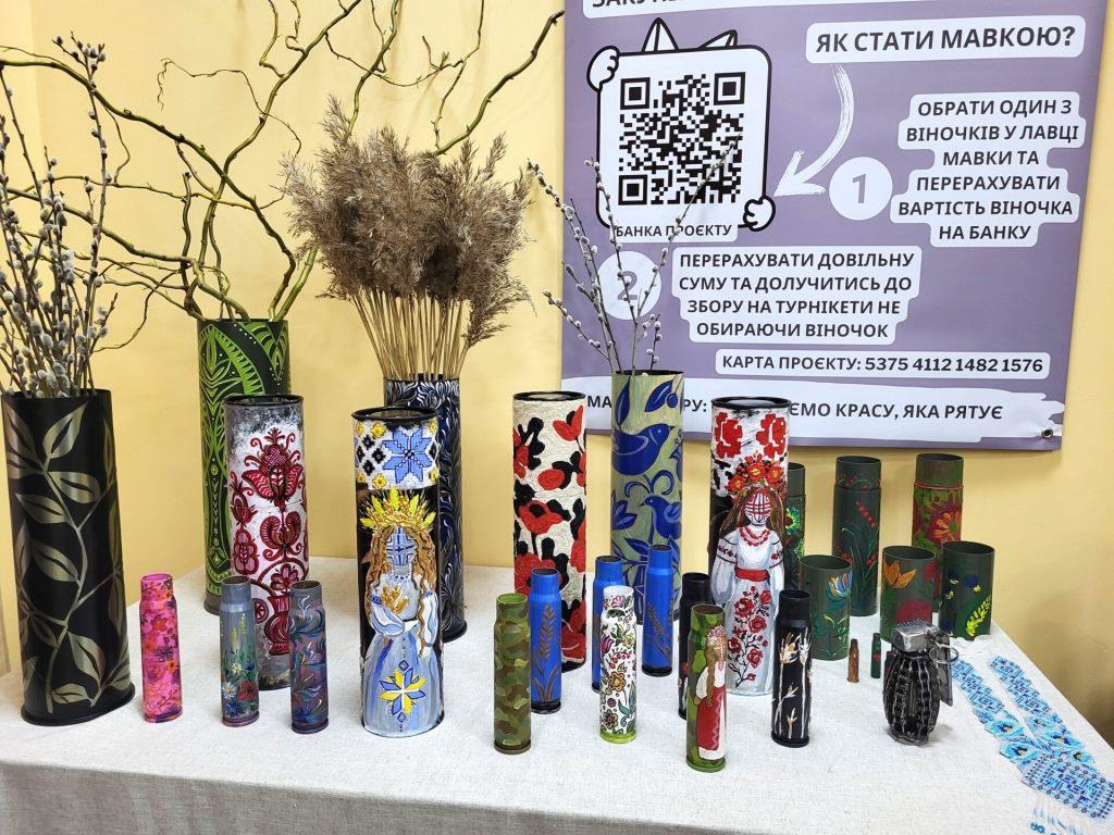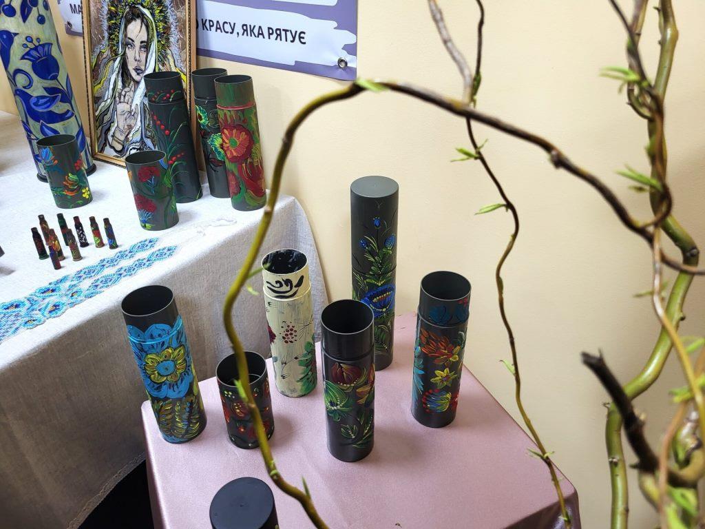 Кожен виріб має назву, QR-код, за яким можна дізнатись його автора, історію створення, вартість. Ще організатори пропонують – брошки Мавок, розфарбовані арт-об’єкти – гільзи, тубуси, що подарував колектив дитячої художньої школи, а також учасники одного з майстер-класів.