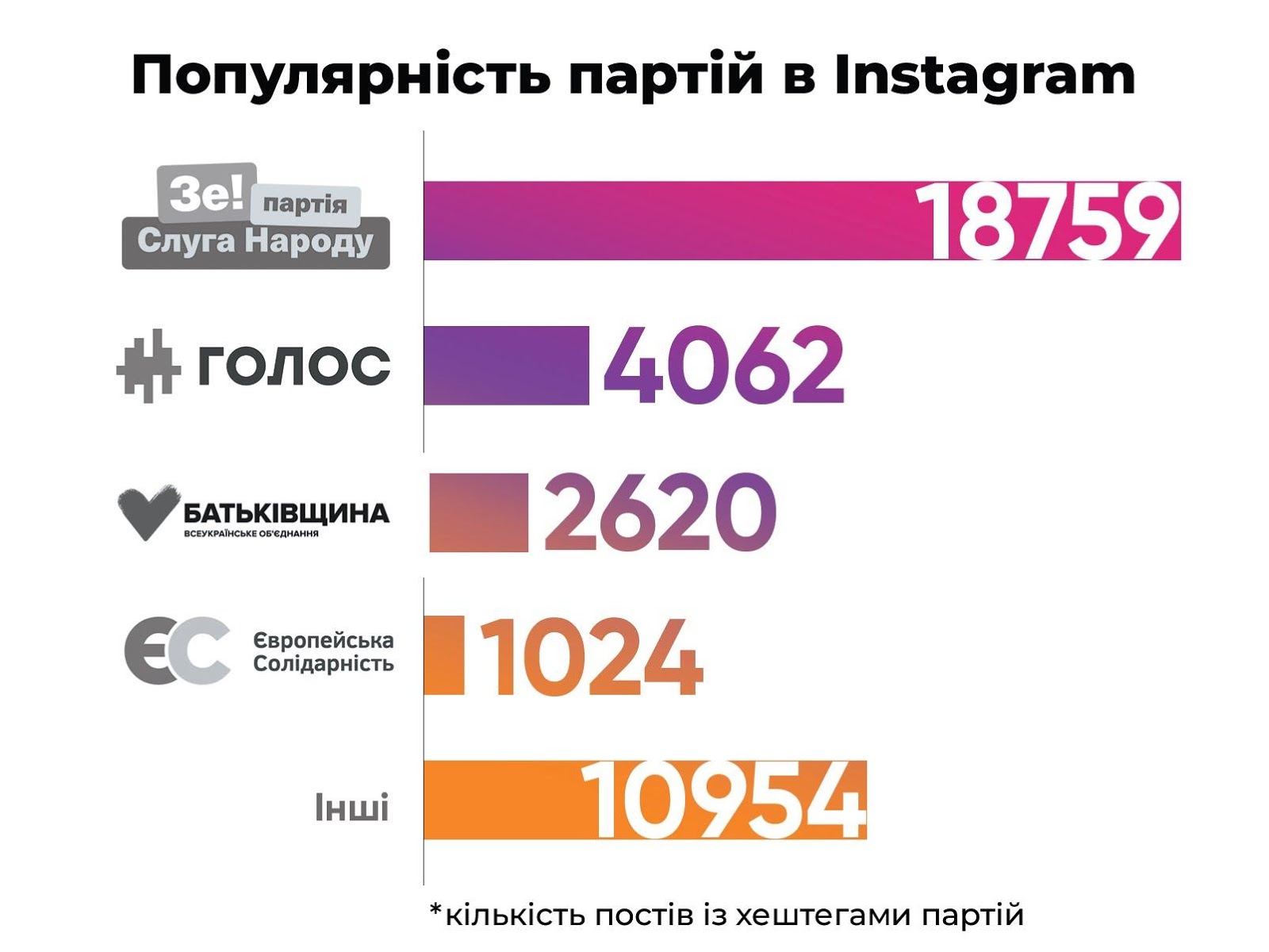 Водночас для «Слуги народу» цей показник сягнув 61 % всіх постів про партію. Там партія Зеленського мала удвічі більше згадок, ніж чотири інші партії у всіх постах разом (17 945 супроти 9 519 відповідно). В «Instagram» цей показник більш ніж подвійний.