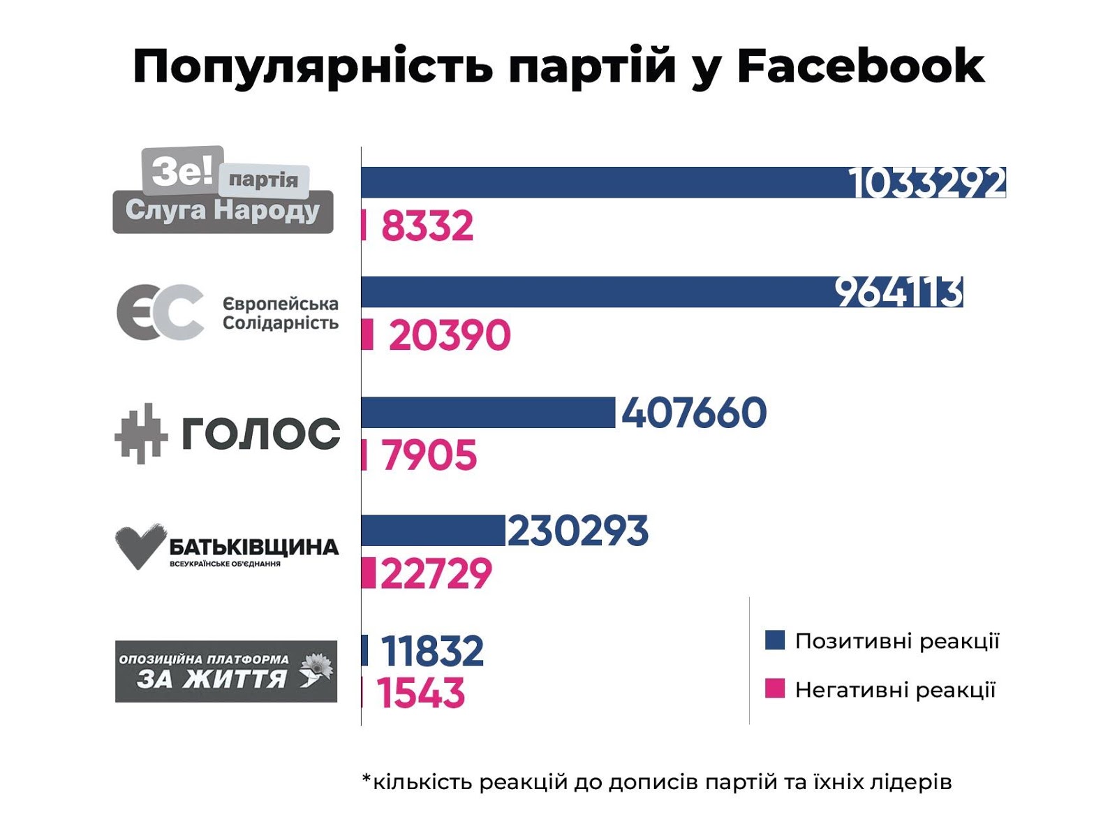 У Facebook негативна риторика досі переважає над позитивною стосовно усіх партій, за винятком «Батьківщини». Негативні пости налічують 53 % проти 10 % позитивних. Водночас офіційні Facebook-сторінки партій демонструють протилежний тренд: 98 % постів до всіх партій, окрім ОП, були позитивними.