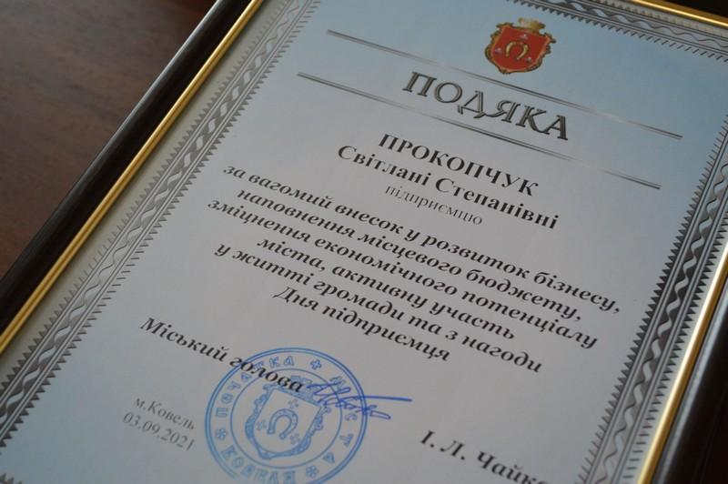 За вагомий внесок у розвиток бізнесу, наповнення місцевого бюджету, зміцнення економічного потенціалу міста, благодійну діяльність на благо Ковеля і громади та з нагоди професійного свята відзначено Подякою міського голови: директора ТОВ «ІВС-ТРАНС» Василя Горішного, директора ТОВ «ВОЛИНЬБУДТЕХ» Руслана  Демчука, директора ВКПП «АГРОПРОМТЕХЦЕНТР Павла Семенюка, підприємців – Світлану Прокопчук, Олександра Кутнього, Наталію Юсюк, Віктора  Оліферовича.