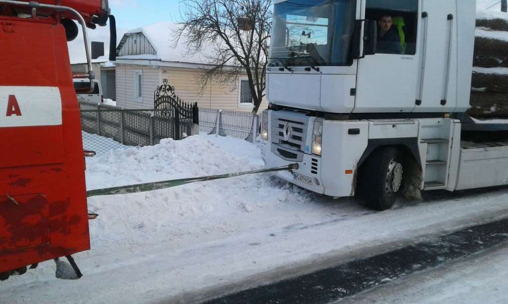 У місті Рожищі на вулиці Промисловій забуксував у снігу вантажний автомобіль, що транспортував деревину. Працівники 3-ої Державної пожежно-рятувальної частини міста Рожища відбуксирували великогабаритний транспортний засіб на стійку ділянку автодороги.