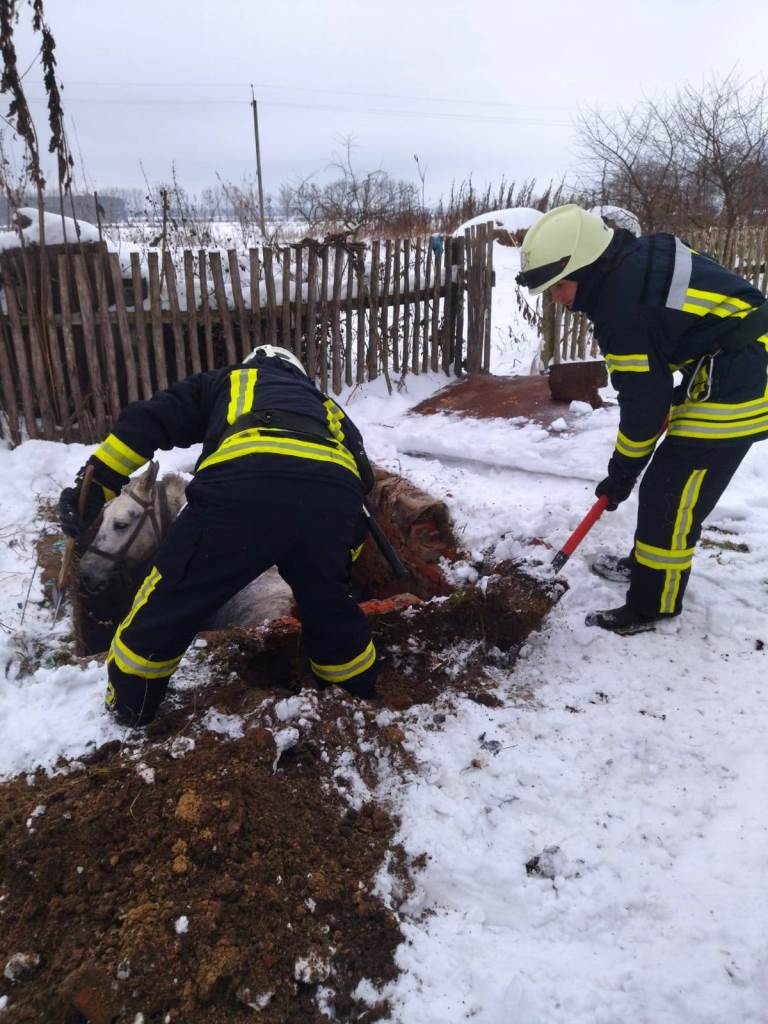 У селі Погіньки Голобської громади працівники 21 ДПРП виїжджали на порятунок тварині – у вигрібну яму провалився кінь. Вони розкопали яму, відкачали воду дренажним насосом й за допомогою мотузки й буксирувального троса витягнули коня з пастки.