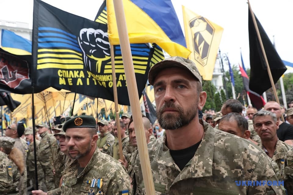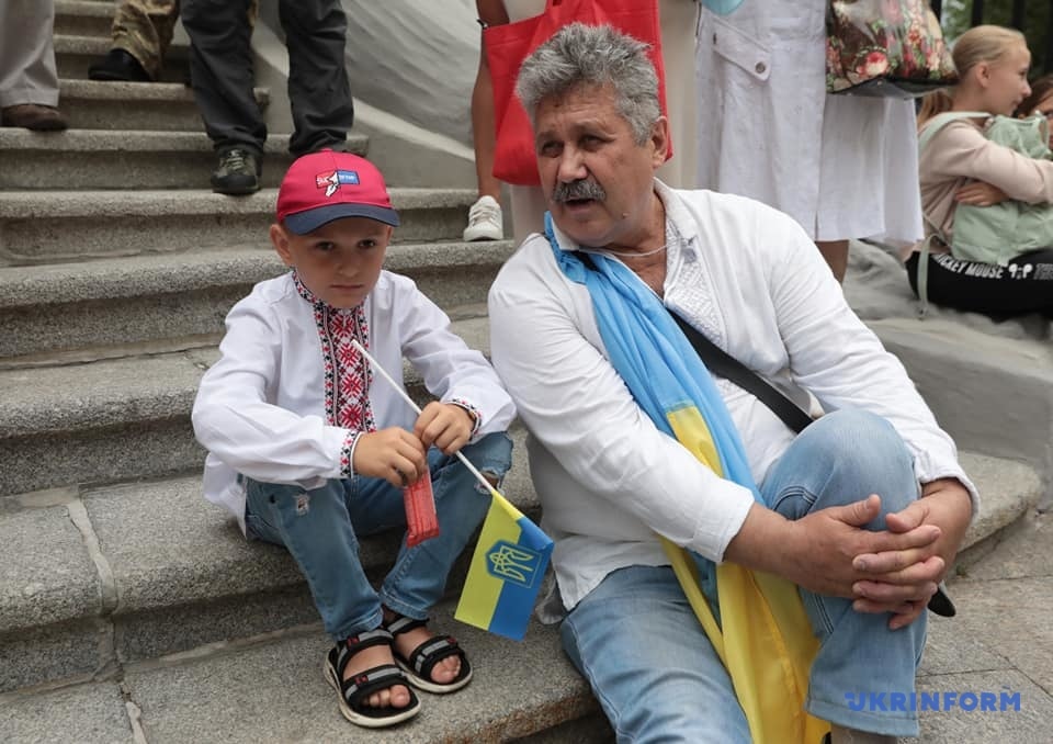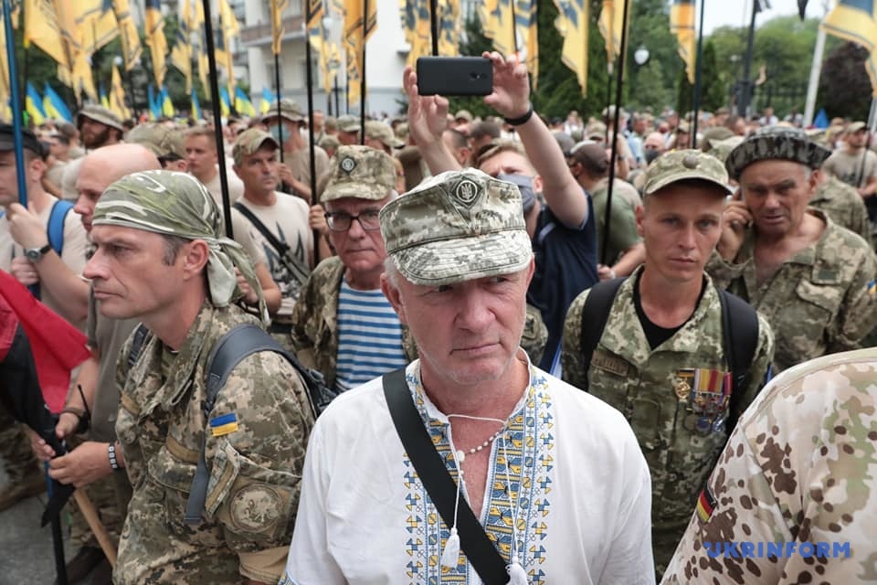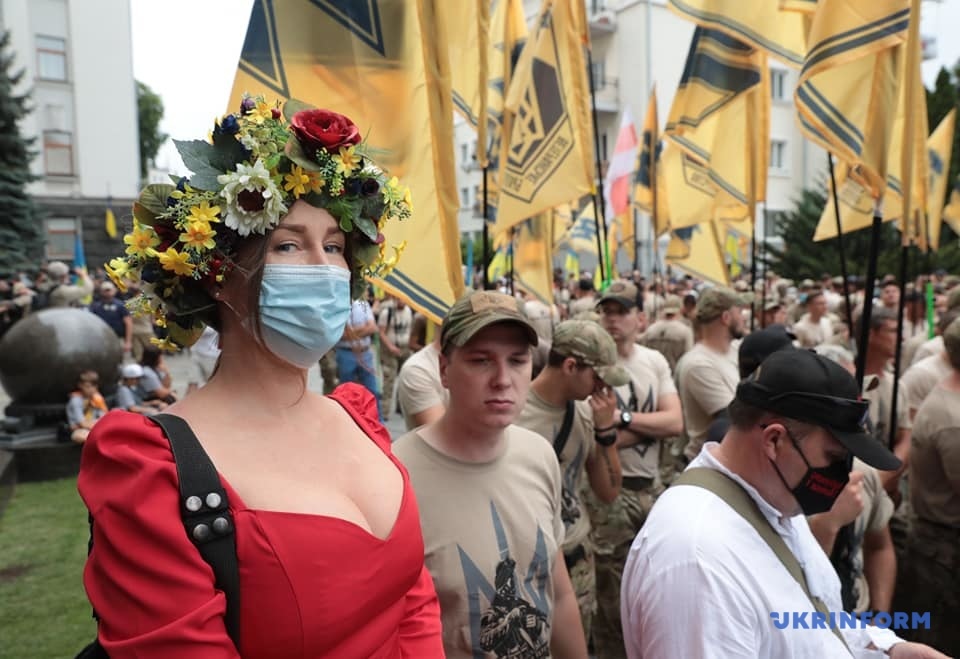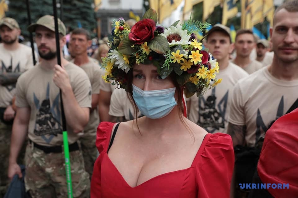 На акції багато державних прапорів, а також знамен з патріотичною символікою. Люди одягнені, переважно, у мілітарі-одяг, дехто – у вишиванках.