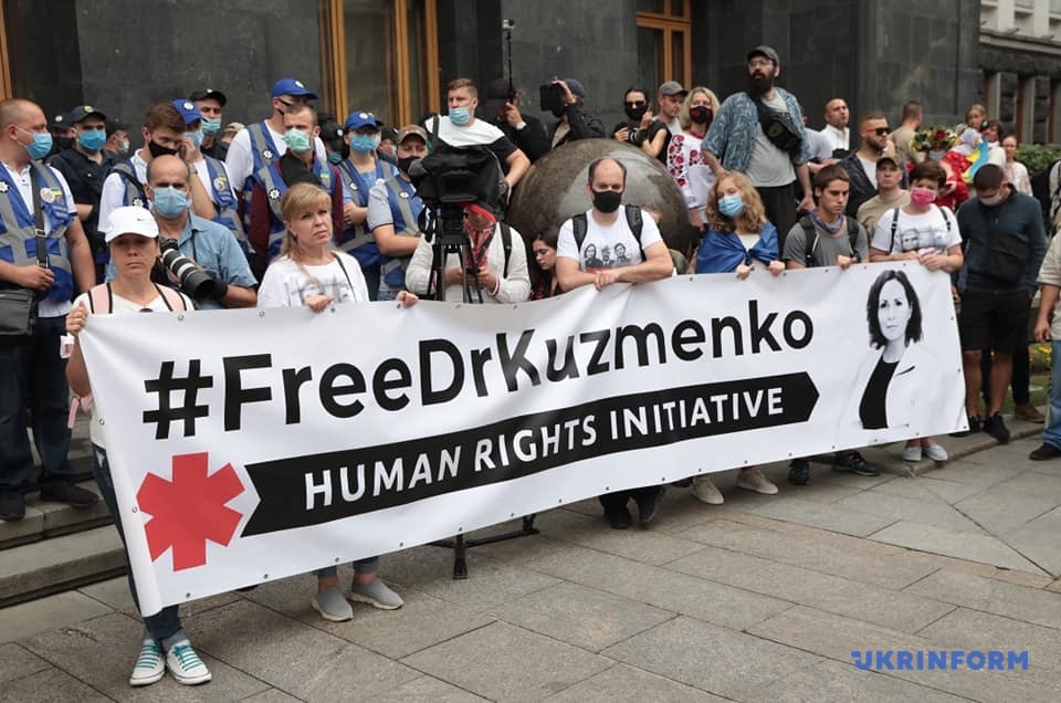 Як повідомляє кореспондент «Укрінформу», кількасот мітингувальників зібралися на площі перед будівлею ОП. Перед входом до неї учасники акції тримають банер Free Dr Kuzmenko, Free Dugar.