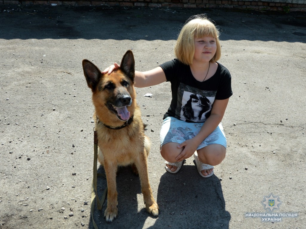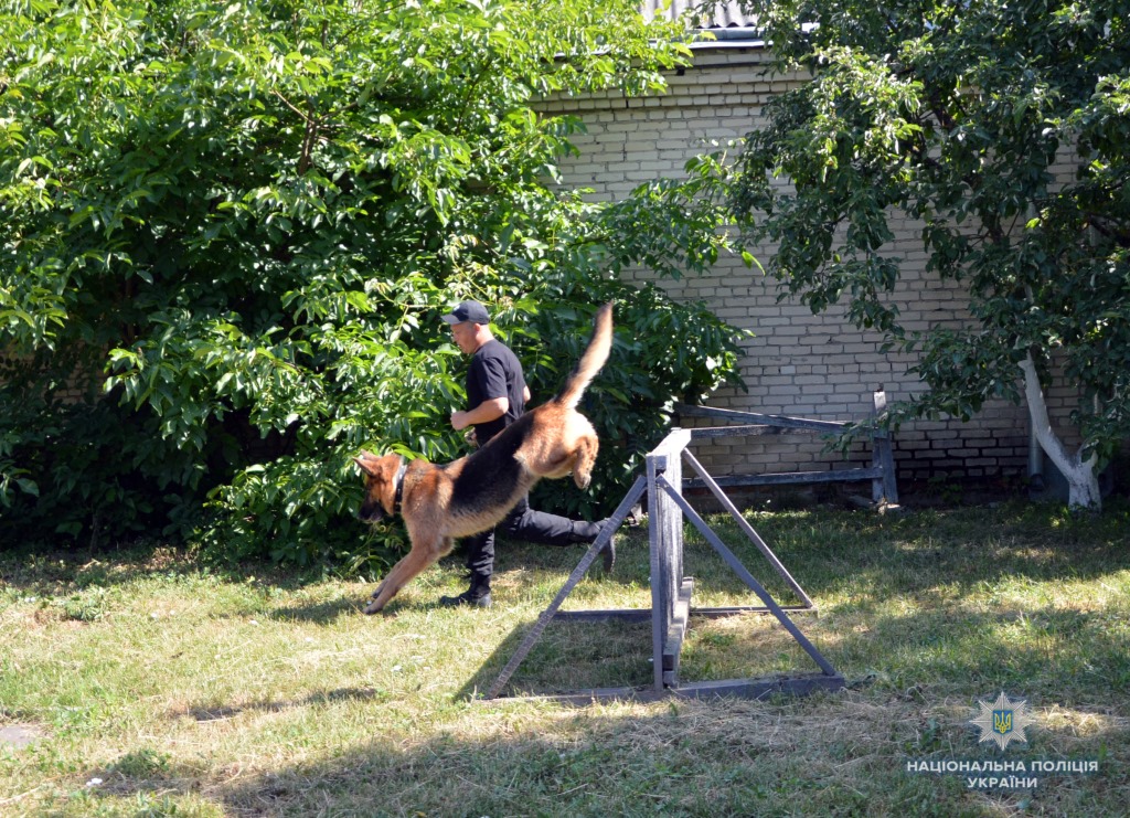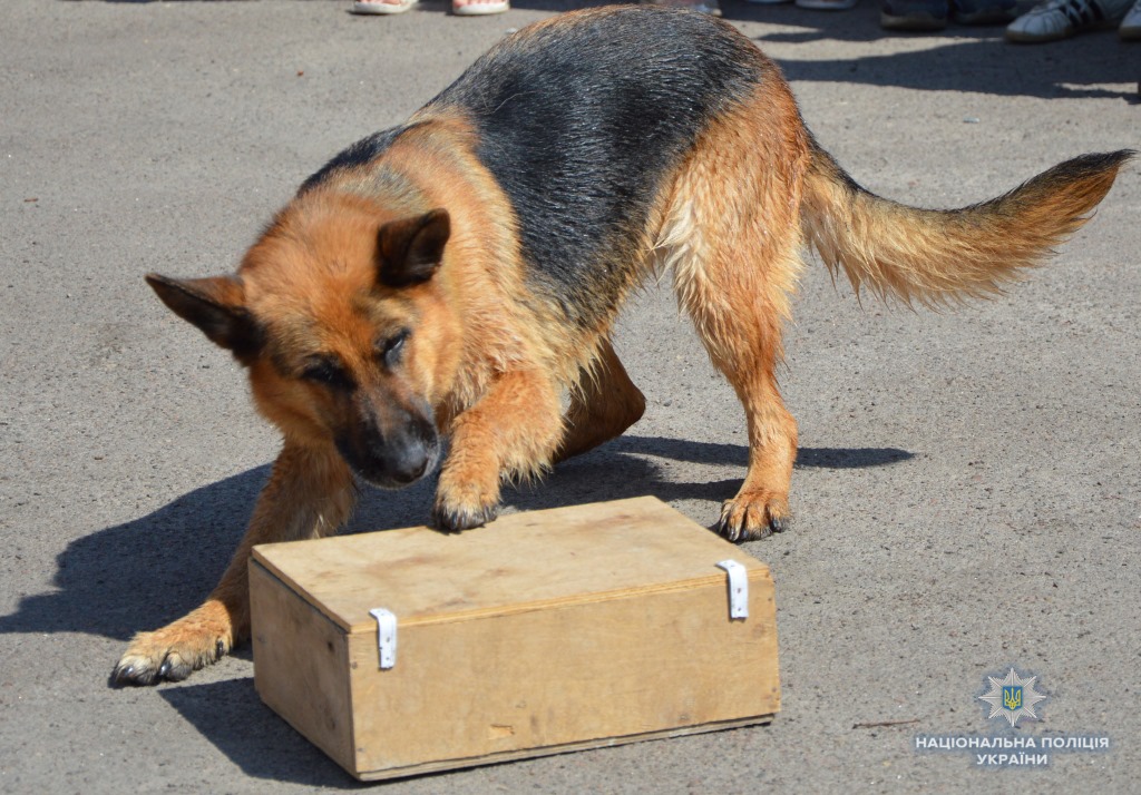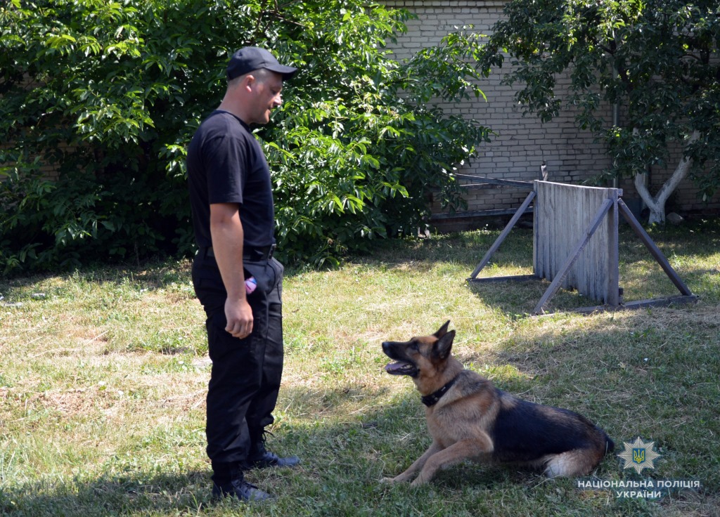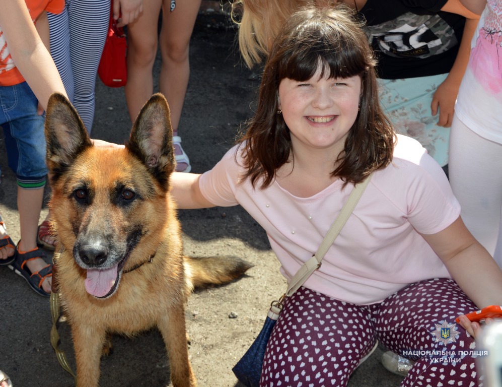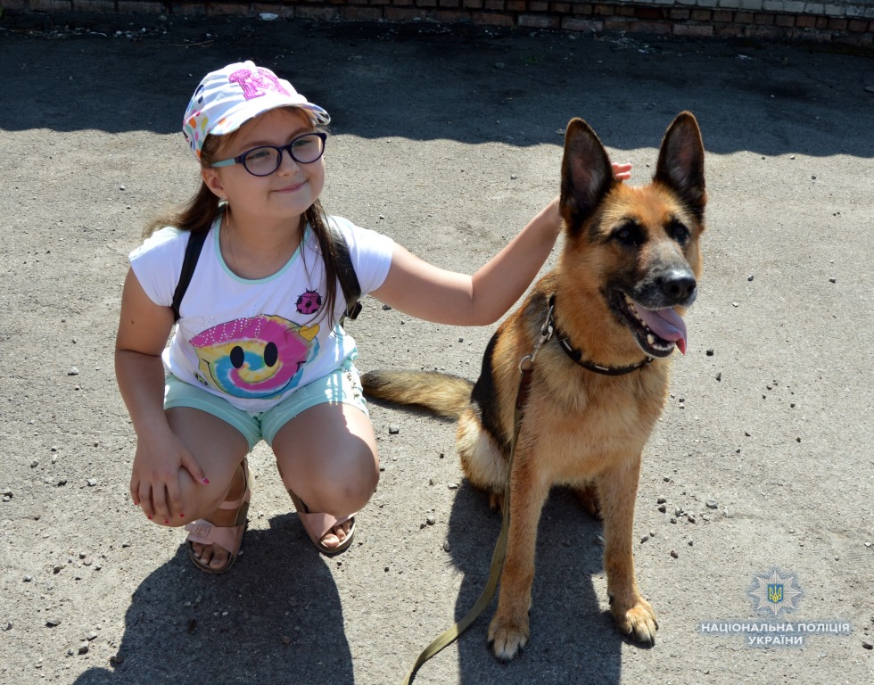 Молодший інспектор-кінолог кінологічного центру Микола Головій із підопічною німецькою вівчаркою Джолі продемонстрували учням вміння собаки проходити смугу перешкод, шукати по запаху взуття, захищати свого господаря від нападника, а також виконувати команди «сидіти», «лежати», «дати лапу».