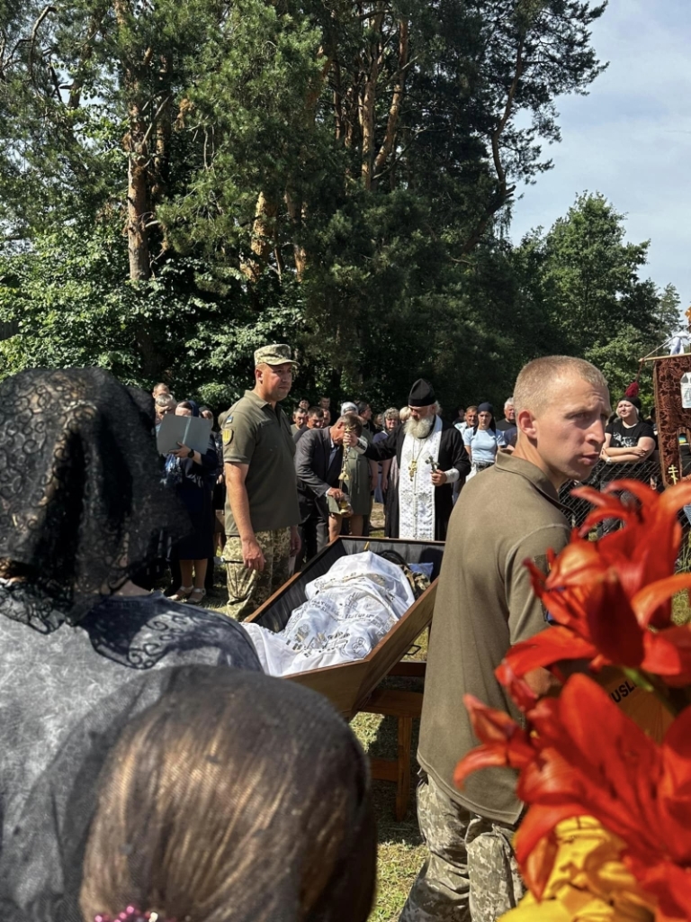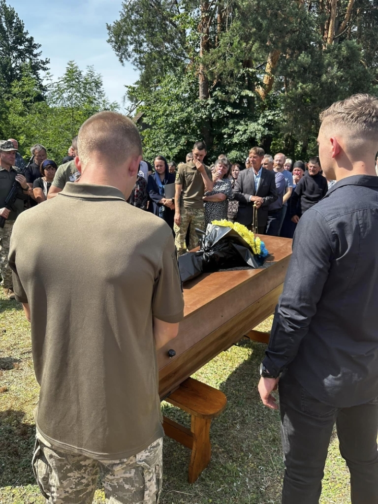 Брати полеглого в глибокій скорботі прощалися востаннє з рідним братом, несучи з військовими труну на руках…з дому – в обійми сирої землі – шлях у вічність. Боліло…боліло в кожній клітинці рідних людей, бо втратили свого найдорожчого – брата.