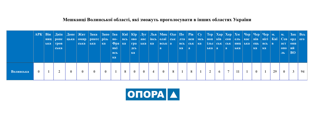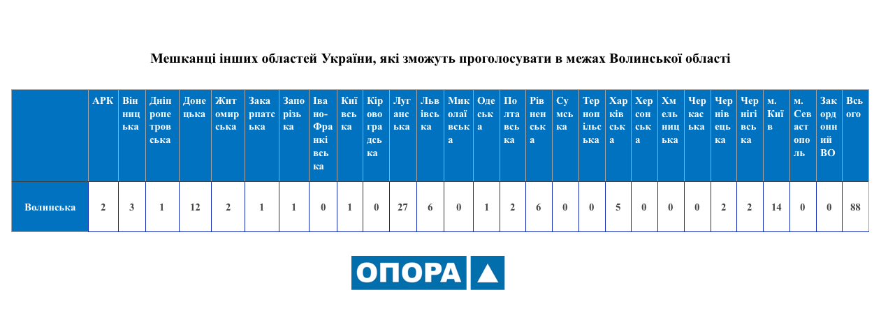 Серед них: 1 мешканець регіону голосуватиме у Вінницькій області, 2 – у Дніпропетровській, 1 – в Івано–Франківській, 8 – у Київській, 4 – у Львівській, 8 – в Одеській, 1 – у Полтавській, 8 – у Рівненській, 1 – у Сумській, 2 – у Тернопільській, 6 – у Харківській, 7 – у Херсонській, 11 – у Хмельницькій, 1 – у Черкаській, 1 – у Чернігівській. Ще 29 волинян проголосують у місті Києві, а 3 – у закордонному виборчому окрузі.