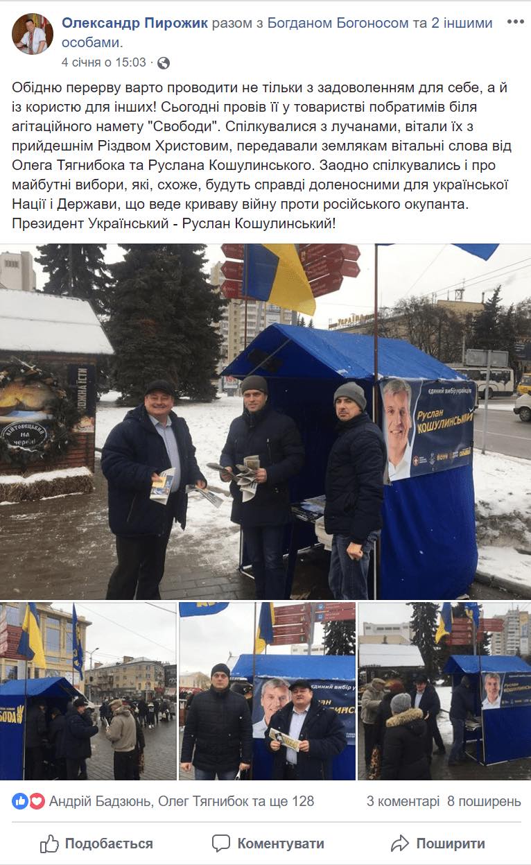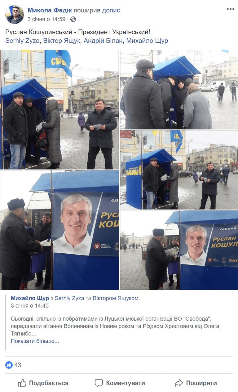 Окремі депутати активно висвітлюють цю діяльність у соцмережах, підписуючи свої повідомлення текстом «Руслан Кошулинський – президент український!». Так, наприклад, із відповідним гаслом допис розмістили Микола Федік та Олександр Пирожик. Натомість Андрій Білан у своєму дописі зазначає, що із партійного намету вітали мешканців округу із різдвяними святами від ВО «Свобода» та «агітували за єдиного кандидата від націоналістичних сил у Президенти України Руслана Кошулинського».