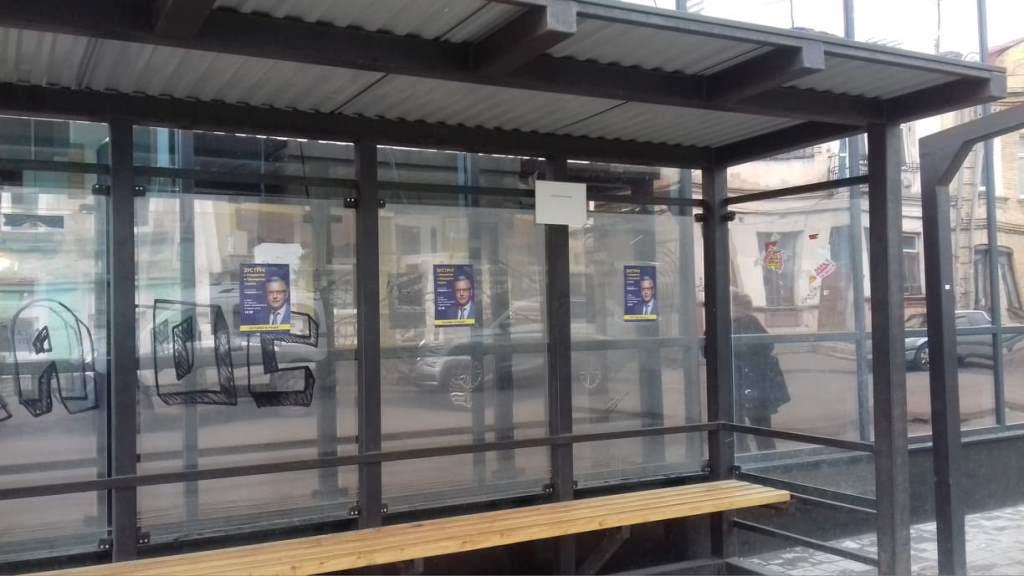 Окрім того, у місті продовжують розміщувати матеріали на користь Руслана Кошулинського у невстановлених для цього місцях. Зокрема, 13 березня спостерігачі виявили наліпки із зображенням кандидата на каркасі зупинки громадського транспорту на вулиці Богдана Хмельницького, у той час, як на тій же зупинці була обладнана дошка для розміщення друкованих матеріалів.