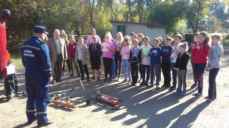 Співробітники ДСНС продемонстрували учням пожежно-рятувальну спецтехніку та обладнання, що використовується під час ліквідації пожеж і надзвичайних ситуацій. Також показали принцип роботи гідравлічного інструменту – незамінного обладнання для деблокування потерпілих з автомобілів, що потрапили у дорожньо-транспортну пригоду. Під час заняття відбулося також гасіння імітованої пожежі.
