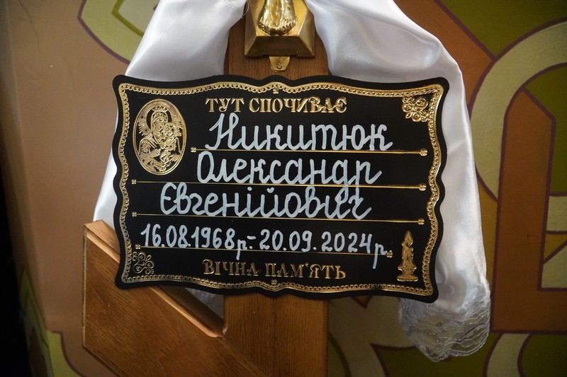 Труну з тілом, вкриту синьо-жовтим стягом, до монастирського храму привіз автомобіль місії “На щиті”. Протягом усієї служби до домовини, що потопала у квітах, підходили ті, хто знав та поважав за життя Олександра Никитюка. Зокрема, колеги-поліцейські згадують Олександра Євгеновича як справжнього професіонала, мудрого наставника, надійного друга та товариша, щиру та порядну людину, яка завжди з честю та гідністю виконувала свій службовий обов’язок.