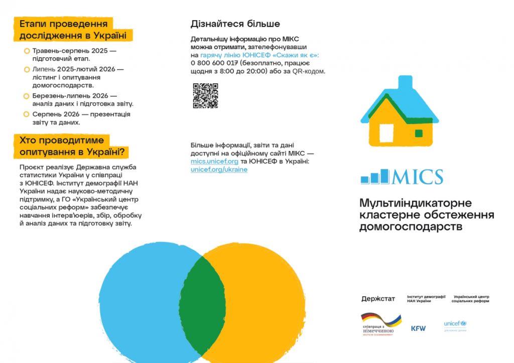 Державна служба статистики України у співпраці з Інститутом демографії та досліджень імені Михайла Васильовича Птухи НАН України, ГО “Український центр соціальних реформ” та за підтримки ЮНІСЕФ в Україні розпочинає новий раунд Мультиіндикаторного кластерного обстеження домогосподарств (МІКС). До слова, проведення дослідження передбачено на період 2025–2026 років.