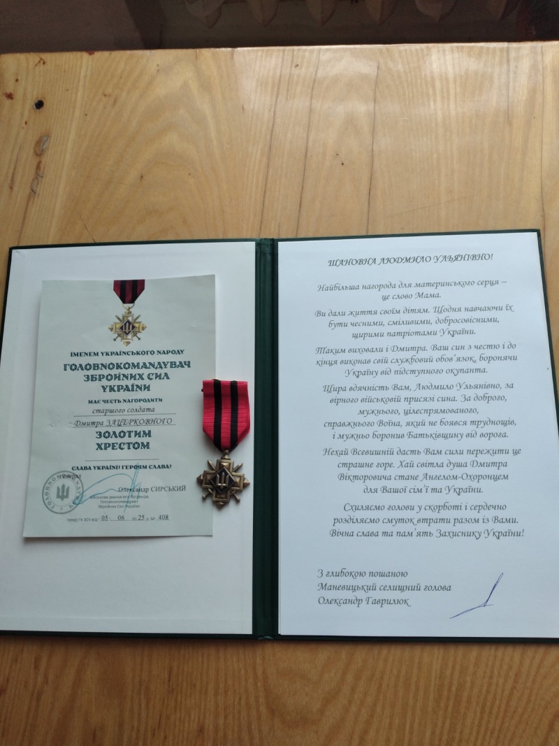 У селі Колодії мамі загиблого захисника України Дмитра Зацерковного Людмилі Ульянівні передали відзнаку Головнокомандувача Збройних Сил України «Золотий хрест», на яку її син заслужив своєю службою, але отримати її за життя не встиг.