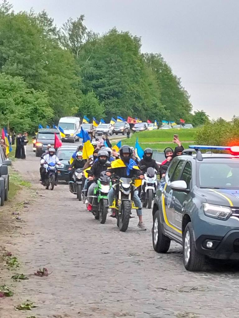 Довга колона автомобілів з державними прапорами супроводжувала траурний кортеж до батьківської домівки.