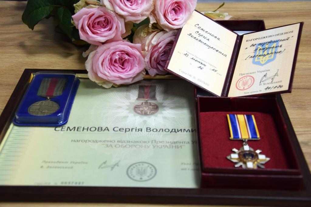 Посмертну нагороду прикордонника його дружині Тетяні та донці Євгенії сьогодні вручив перший заступник начальника Волинського прикордонного загону – начальник штабу Євгеній Ущук. А відзнаку Президента «За оборону України», якою Семенова також нагородили посмертно, отримав син Дмитро.