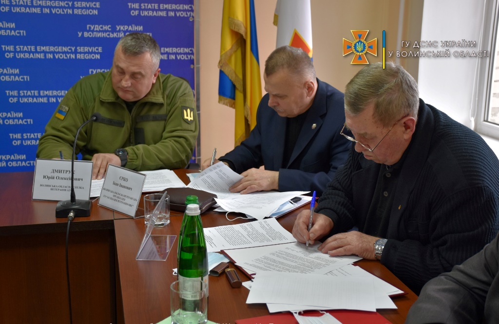 У Луцьку Меморандум підписали: начальник ГУ ДСНС області генерал-майор служби цивільного захисту Володимир Грушовінчук, голова обласної організації у справах ветеранів Костянтин Байчук, голова обласної спілки ветеранів АТО Юрій Дмитрук, голова громадської ради при голові ОДА «Союз інвалідів Чорнобиля Волині» Ростислав Кухтей, голова Волинської обласної ради громадської організації “Всеукраїнська асоціація ветеранів війни та служби цивільного захисту” Павло Копилов, від Волинської обласної ветеранської організації «ГО Асоціація ветеранів МВС» Сергій Шелепін.