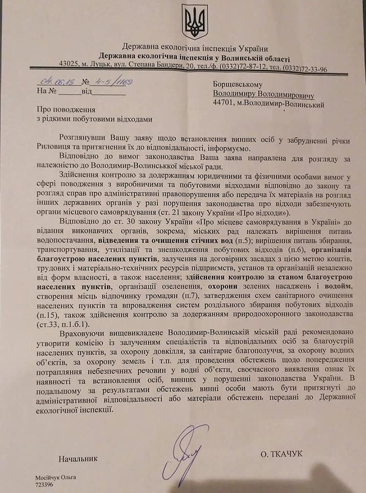 Направивши звернення до Володимир-Волинської міської ради та Державної екологічної інспекції України Володимир отримав відповідь від екологів про те, що вони тут безсилі і вся відповідальність, за їхніми словами, лежить на органах місцевого самоврядування. Від міської ради Володимир взагалі не отримував відповіді”, — повідомляє чоловік.