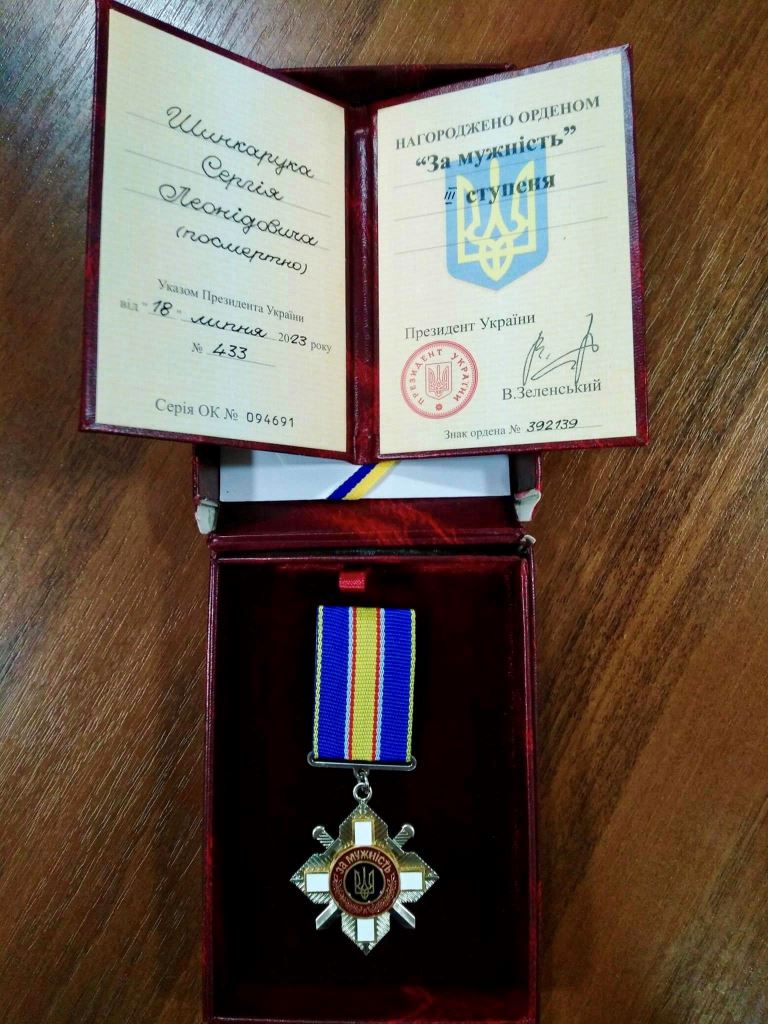 За особисту мужність і самовіддані дії, виявлені у захисті державного суверенітету та територіальної цілісності України солдата Шинкарука Сергія Леонiдовича 24.02.1988 року народження нагородили орденом «За мужність» III ступеня (посмертно).