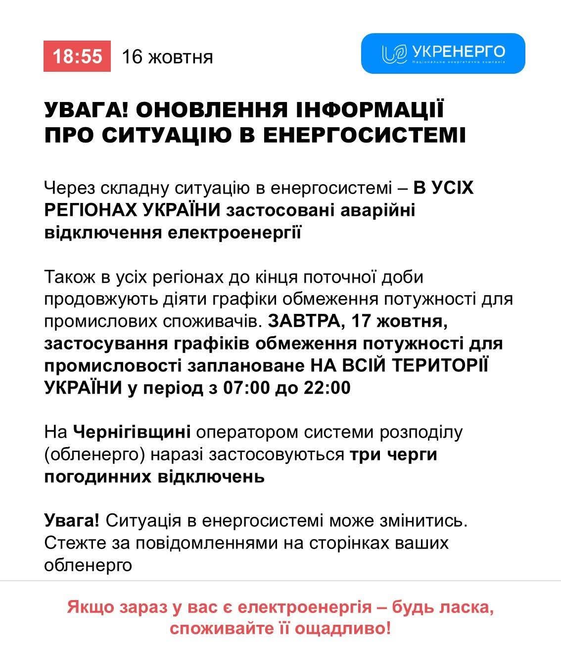 Згідно розпорядження НЕК “Укренерго”, на території Волинської області ввели екстрені графіки аварійних відключень з 18:30 16.10.2025.