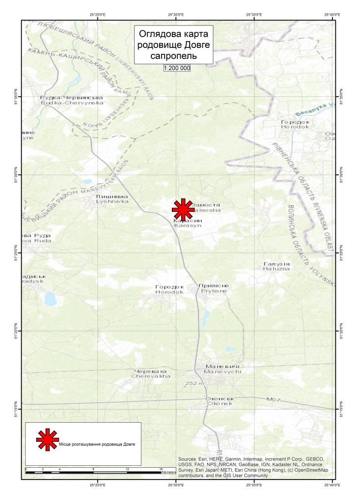 Родовище Довге розташоване в Маневицькому (Камінь-Каширському – відповідно до постанови Верховної Ради України «Про утворення та ліквідацію районів» від 17.07.2020 № 807-ІХ) районі Волинської області, на північній околиці села Замостя. Вид корисної копалини: сапропель. Вид користування надрами та строк, на який надається дозвіл: видобування, 20 років», – йдеться в описі лоту.