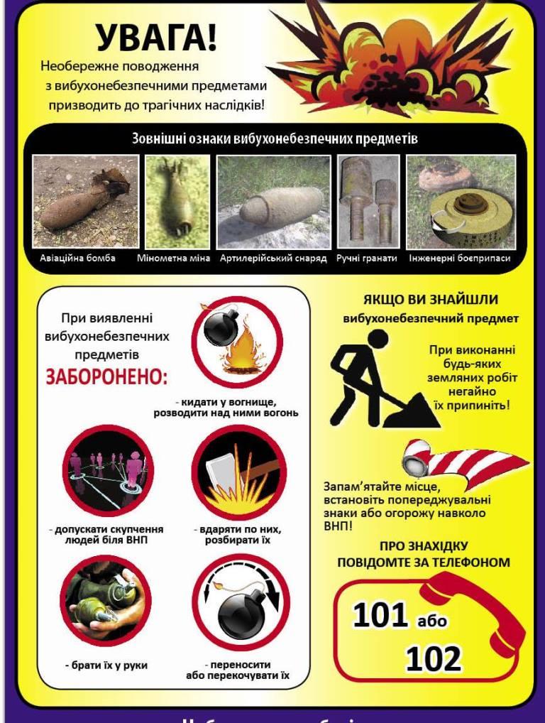 Головне управління Державної служби України з надзвичайних ситуацій у Волинській області вкотре звертається до громадян з проханням: у разі виявлення вибухонебезпечних предметів ні в якому разі не торкатися до них і відразу ж телефонувати за номером 101 або 102.