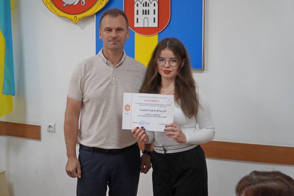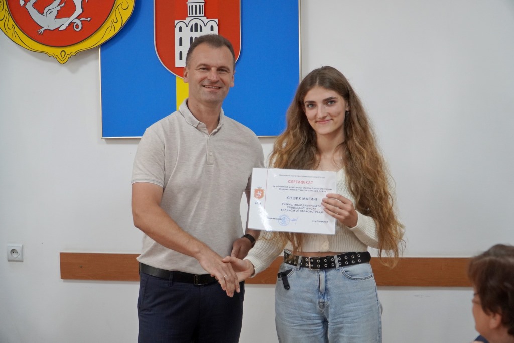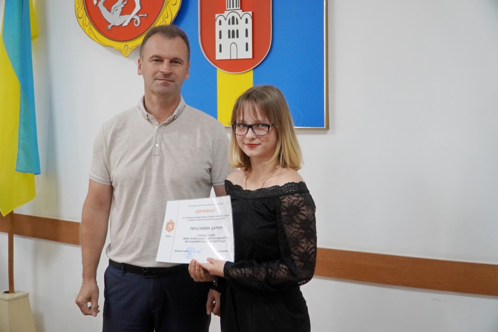 – Дарині Герасимюк, учениці ліцею імені Олександра Цинкаловського Володимирської міської ради;