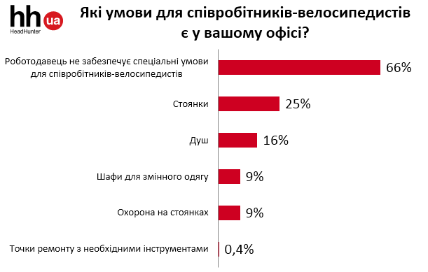 У більшості випадків роботодавець не забезпечує спеціальних умов для співробітників-велосипедистів (так відповіли 66 % респондентів). Але в деяких офісах усе ж створюються певні умови для велобайкерів. Зокрема, 25 % зазначили, що в їхніх компаніях є стоянки. У 16 % – душові. 9 % говорять про наявність шаф для змінного одягу, і ще 9 % – про наявність охорони на стоянках. Менше ніж 1 % респондентів повідомили, що в них є точки ремонту для велосипедів.