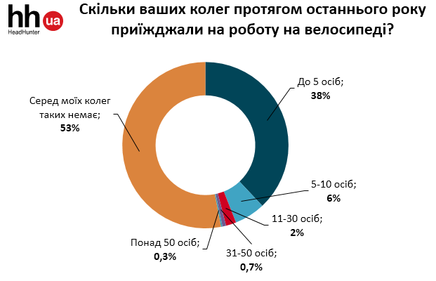 Згідно з даними опитування, 53 % респондентів говорять про те, що серед їхніх колег нема тих, хто їздив би на роботу на велосипеді. А от 38 % опитаних зазначили, що протягом останнього року на роботу велосипедом добиралось до 5 їхніх колег. 6 % повідомили, що від 5 до 10 осіб з їхньої компанії приїжджали в офіс на велосипеді. І лише 3 % зазначили, що таких осіб було понад десяти (2 % – 11-30 осіб, 0,7 % – 31-50 осіб, 0,3 % – понад 50 осіб).