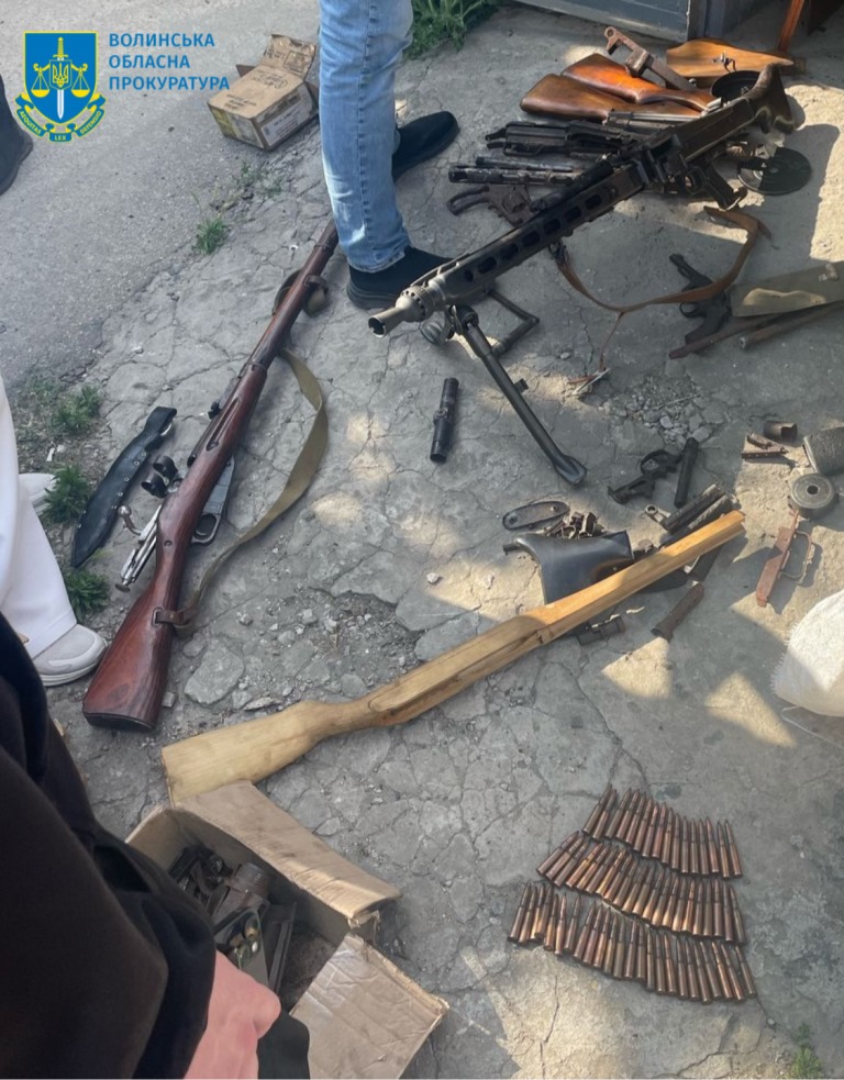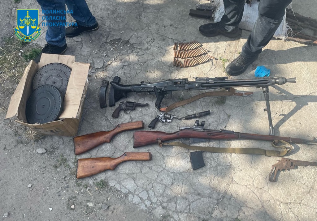 В ході обшуку в гаражі фігуранта виявили та вилучили гвинтівку нарізну Мосіна з прицілом, кулемет MG3, два револьвери, патрони, два магазини до автоматичної зброї, 10 магазинів до кулемета, велику кількість деталей до зброї (приклади, стволи та ін.).