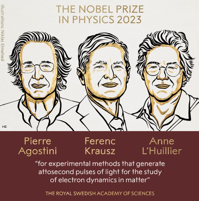 Лауреатами Нобелівської премії в галузі фізики 2023 року стали фізики П’єр Агостіні, Ференц Краус та Анн Л’Юйє «за експериментальні методи, які генерують аттосекундні імпульси світла для дослідження динаміки електронів у речовинах».