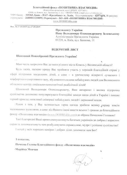«Ваш авторитет і висока підтримка суспільства допоможе популяризувати благодійні заходи щодо дітей в Україні і покаже гарний приклад можливої співпраці небайдужих людей і державної влади…Такі благородні Ваші кроки спонукатимуть багатьох українців до добрих і корисних справ і допомагатимуть нам розбудовувати справедливе, мудре і успішне суспільство!», – зазначила Марійка Мовчан, запрошуючи новообраного Президента на відкриття спортзалу.