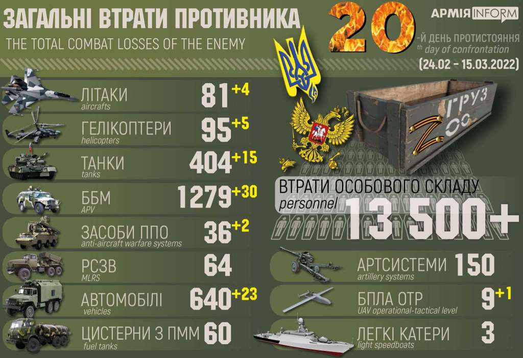 Загальні бойові втрати противника з 24.02 по 15.03.2022 орієнтовно склали: