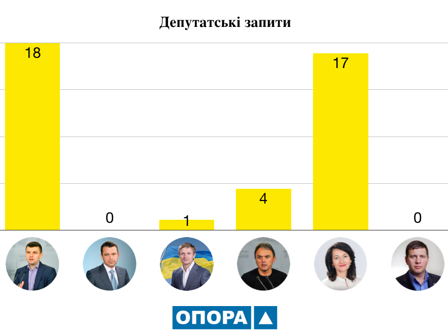 Найбільшу кількість з них підготували народні депутати, які представляють у Раді округи № 19 та № 23, Ігор Гузь та Ірина Констанкевич. На їх рахунку 18 та 17 унікальних запитів відповідно. Представник виборчого округу № 22 Ігор Лапін за цей же період подав 4 унікальні запити, один з яких було направлено одразу 22 суб’єктам (переважно місцевим органам влади та установам). Степан Івахів, який обирався у виборчому окрузі № 21, підготував лише один депутатський запит. Натомість, на рахунку Сергія Мартиняка (ОВО № 20) – жодного запиту.