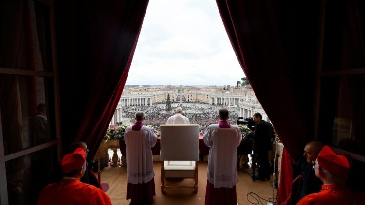 Опівдні на центральному балконі з’явився єпископ Риму в супроводі кардиналів Джеймса Гарвея, архипресвітера базиліки Святого Павла за мурами, та Жозе Толентіно де Мендонси, префекта дикастерії у справах культури та освіти.