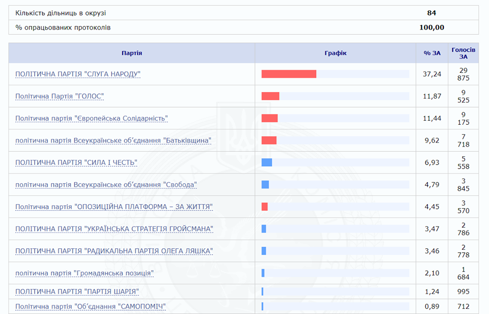 У багатомандатному виборчому окрузі № 22 обробили 100 % протоколів: лідером стала політична партія «Слуга народу».