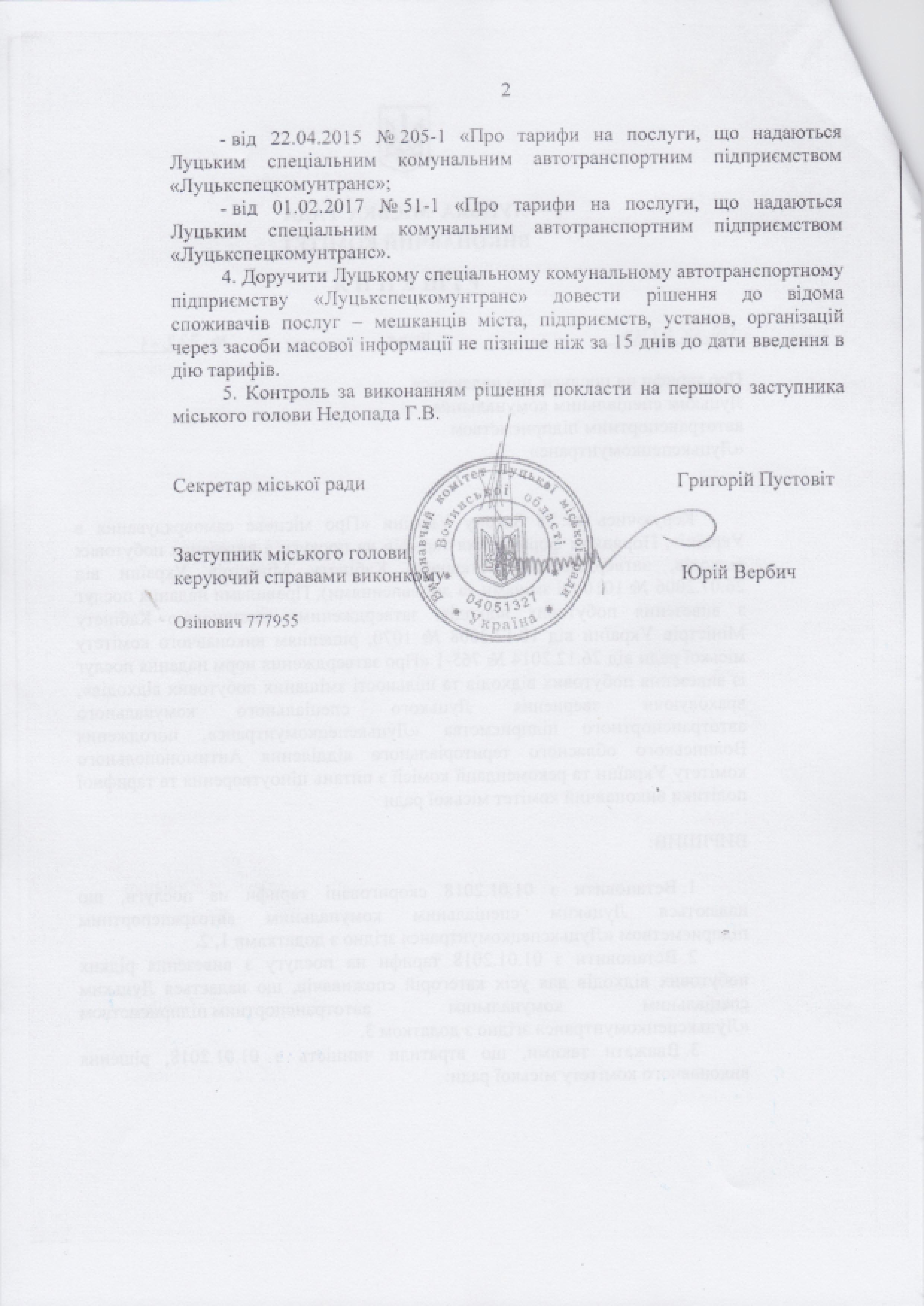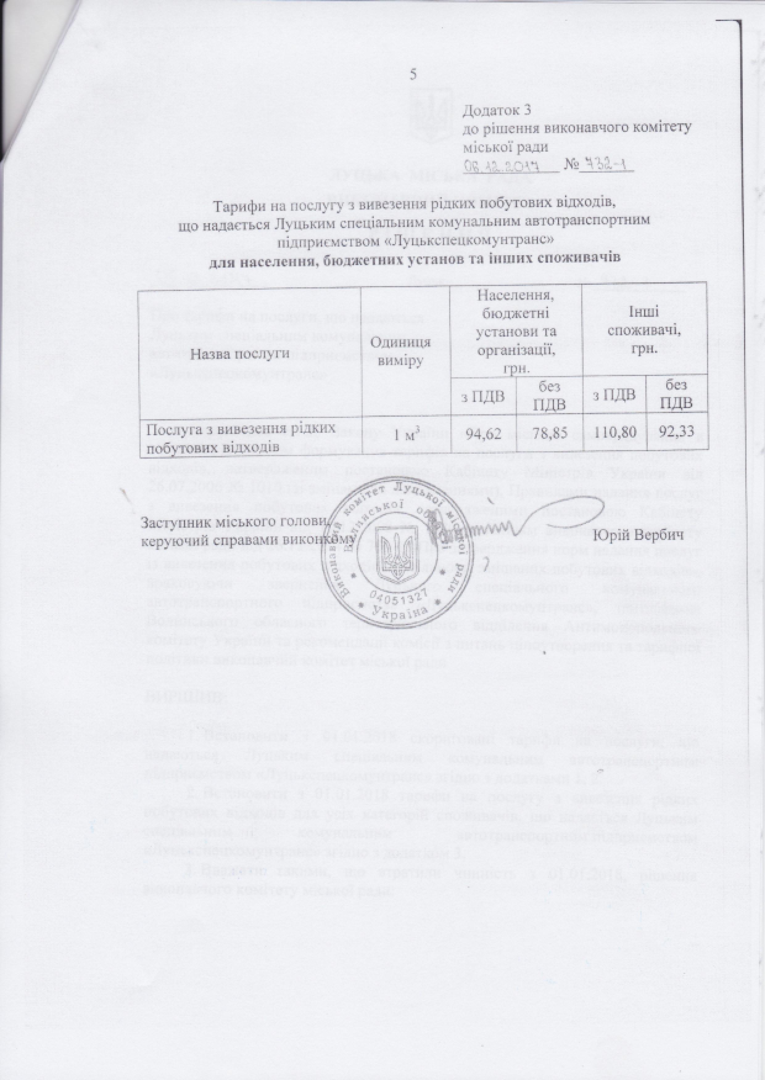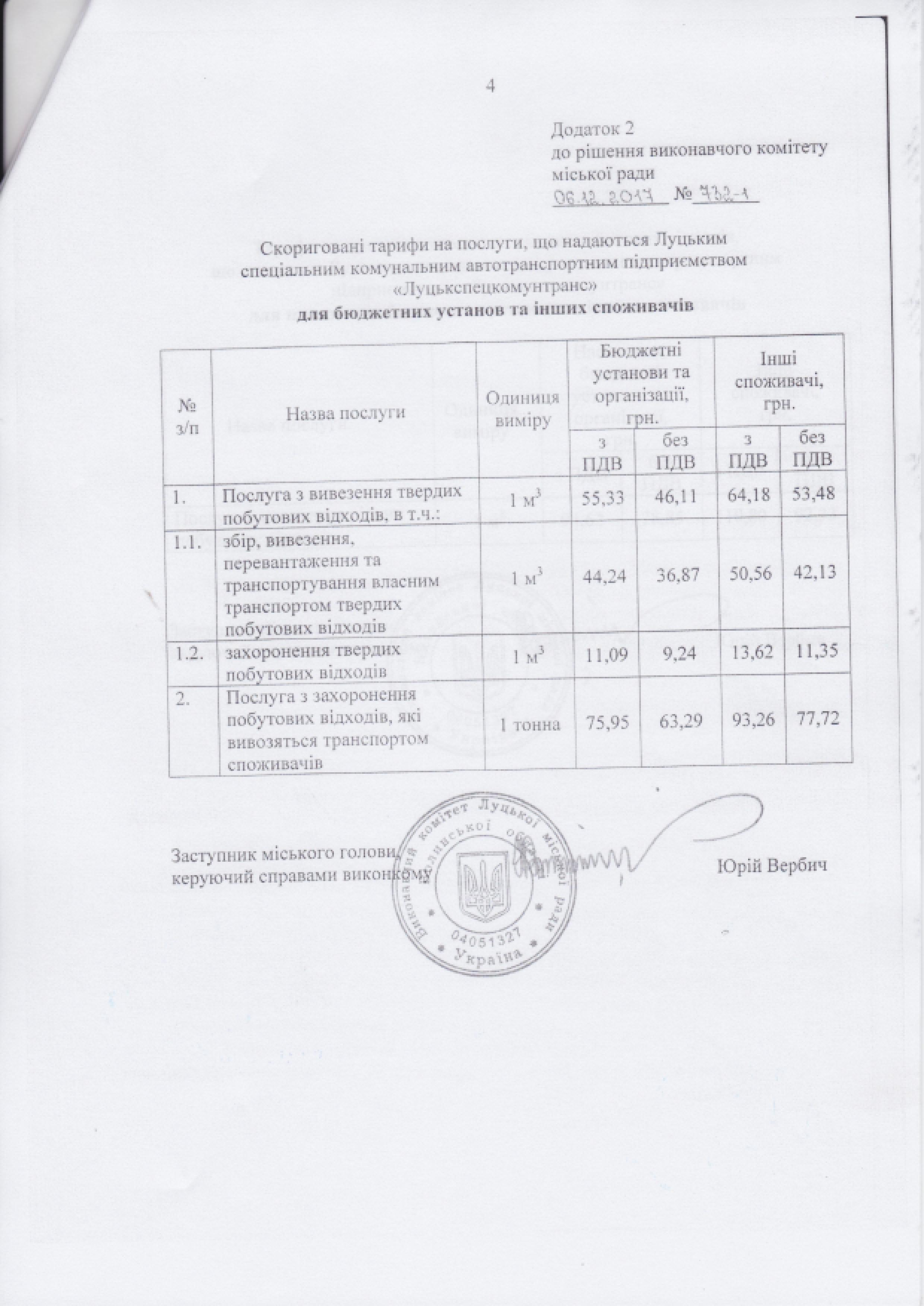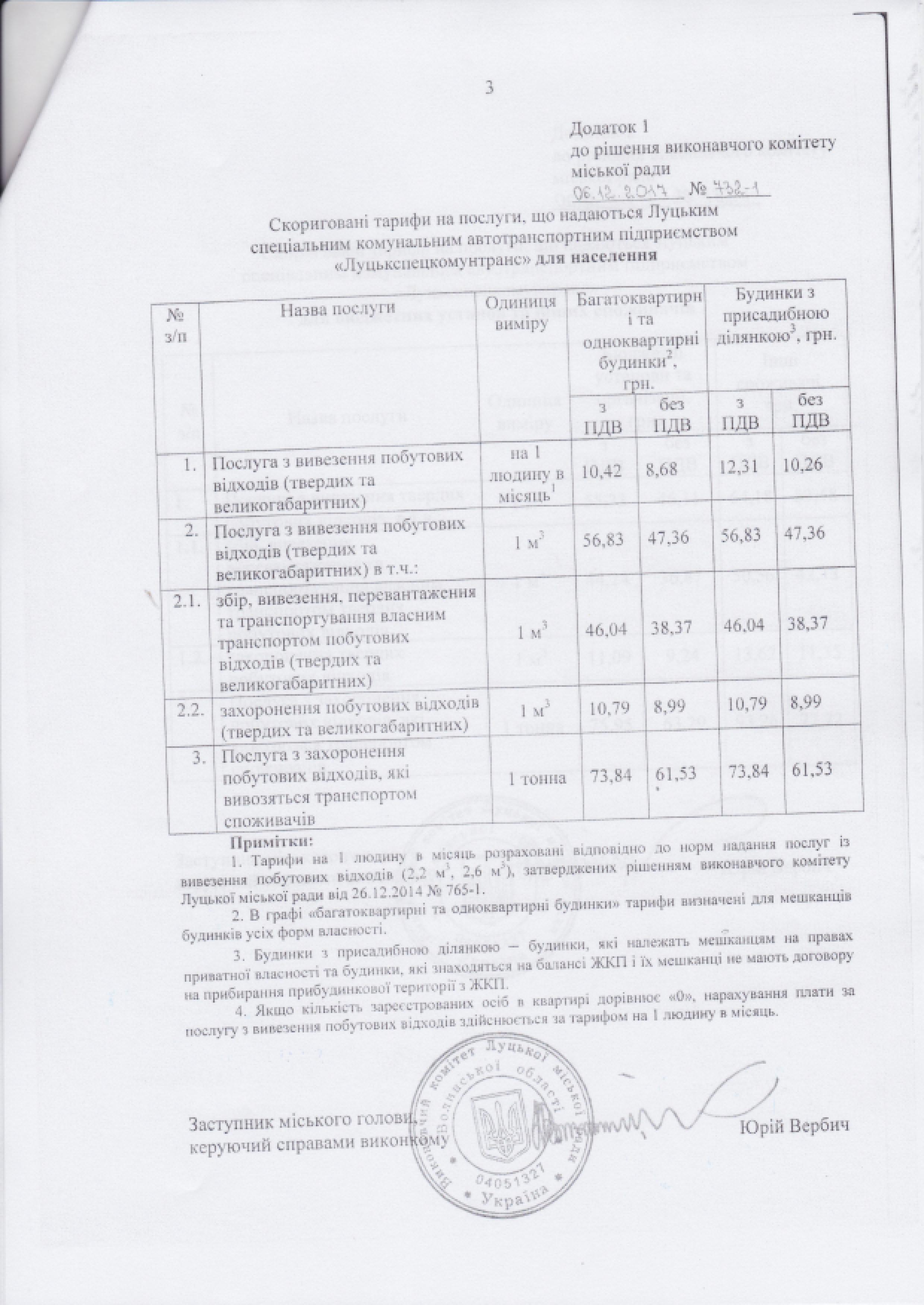 Згідно з п. 1 рішення виконавчого комітету Луцької міської ради від 17.06.2015 № 336-1 «Про визначення виконавців послуг з вивезення побутових відходів у місті Луцьку» на період проведення конкурсу щодо визначення нового виконавця, послугу буде надавати Луцьке спеціальне комунальне автотранспортне підприємство «Луцькспецкомунтранс» за тарифом, затвердженим рішенням  виконавчого комітету Луцької міської ради від 06.12.2017 № 732-1 «Про тарифи на послуги, що надаються Луцьким спеціальним комунальним автотранспортним підприємством «Луцькспецкомунтранс».