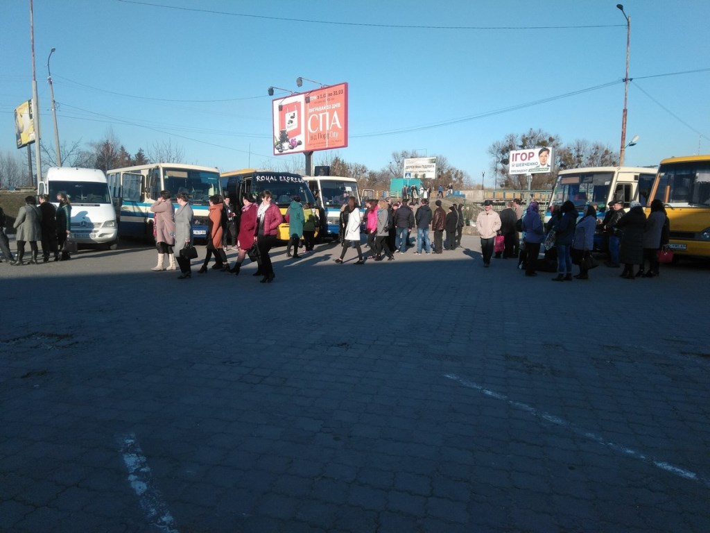 Сотні людей рухалися на вулицю Набережну, де були припарковані близько 20-ти великих автобусів та маршруток із табличками «нерегулярні перевезення».