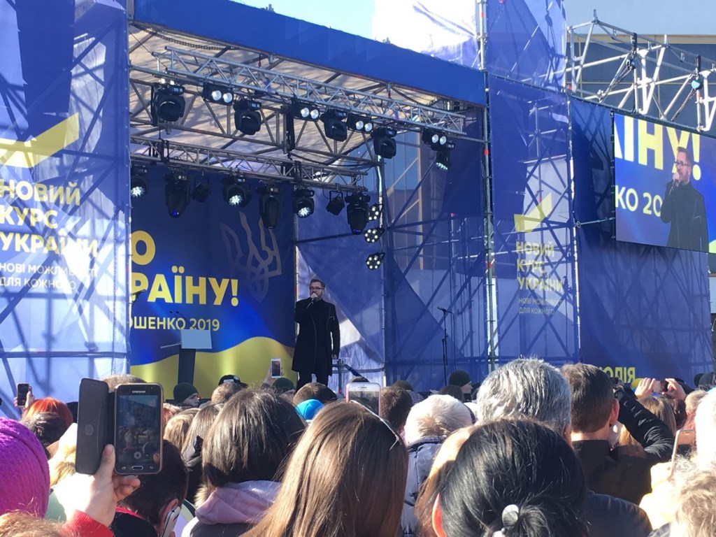 Зауважимо, що зустріч із громадою відбувалася на центральній площі міста – Театральному майдані, де зібралося кілька тисяч людей. Чимало із тих, хто прибув на зустріч, мали сині та жовті шапки і шарфи із надписами «ВірЮ в Україну!». Перехожим роздавали агітаційну продукцію із наметів