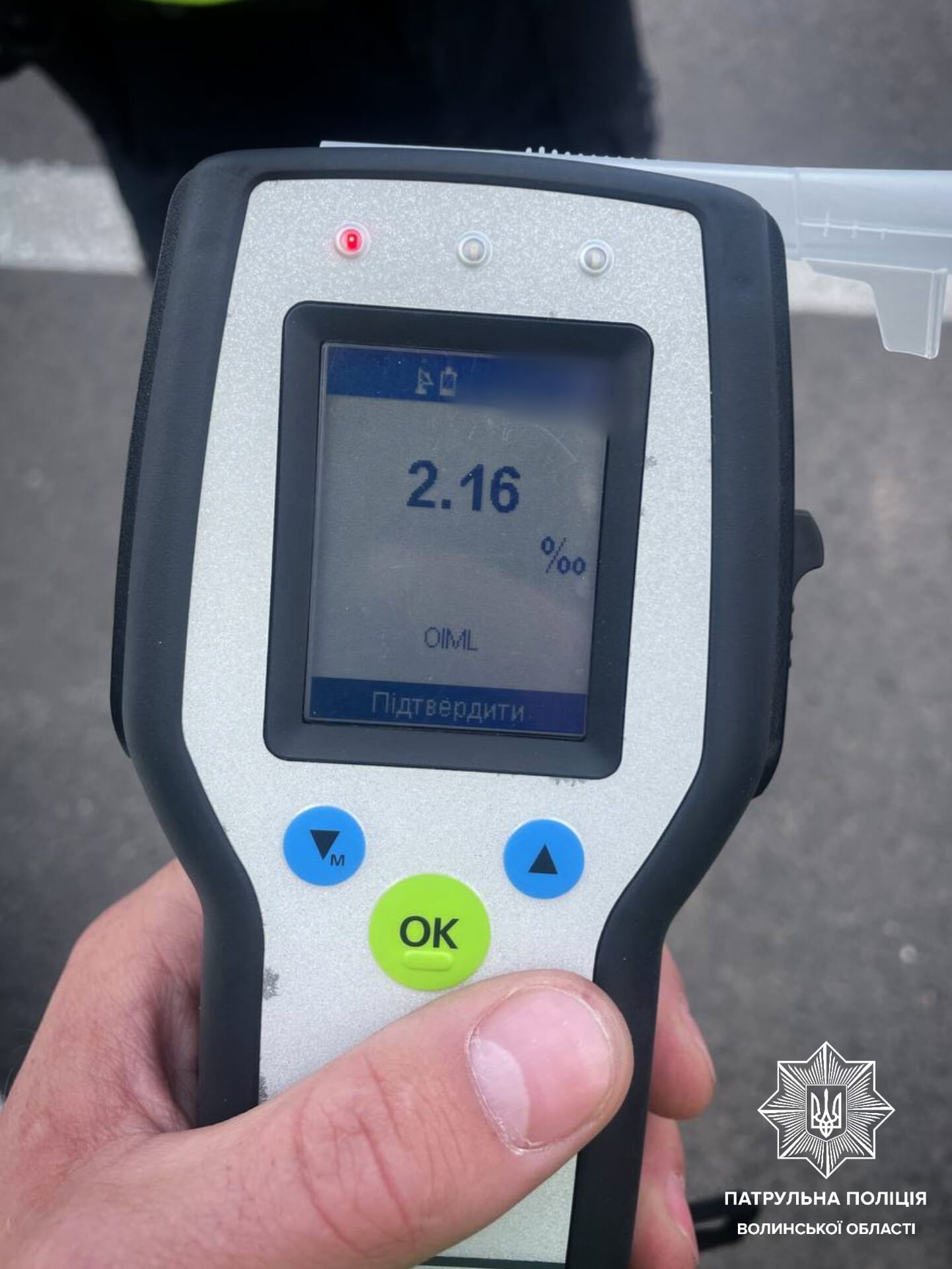 Коли поліцейські підійшли до авто та почали спілкуватися з його 43-річним керманичем, стало зрозуміло, що чоловік перебуває у стані алкогольного сп’яніння. Це підтвердив і Drager, який показав результат 2,16 проміле. Щоправда, водій з таким висновком був не згодний та забажав пройти освідування у медзакладі. Однак і там лікар-нарколог підтвердив, що чоловік керував напідпитку.