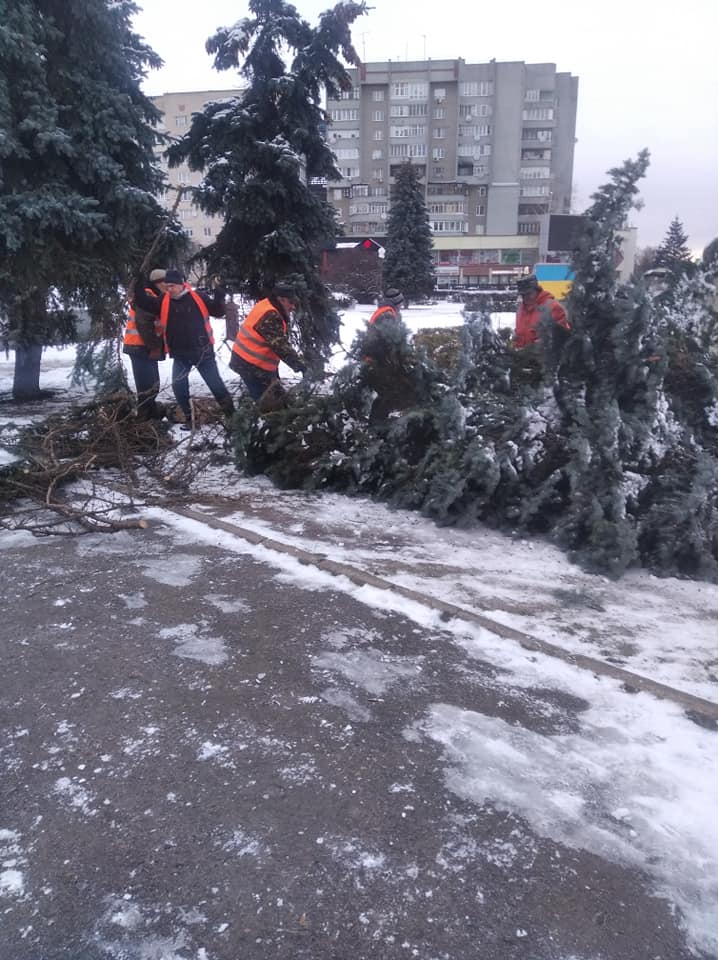 Комунальники зрізали ялинку поблизу будівлі РАЦСу.