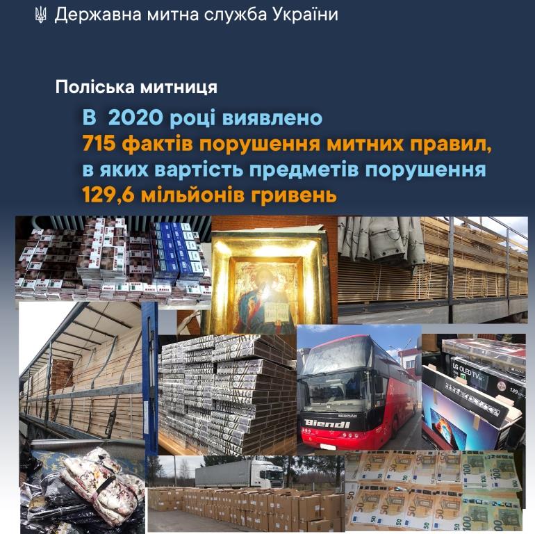Щодо адміністративних правопорушень, то протягом 2020 року завели 715 справ, вартість предметів порушення в яких склала 129,6 мільйона гривень», – повідомив начальник Поліської митниці Держмитслужби Сергій Панчук.