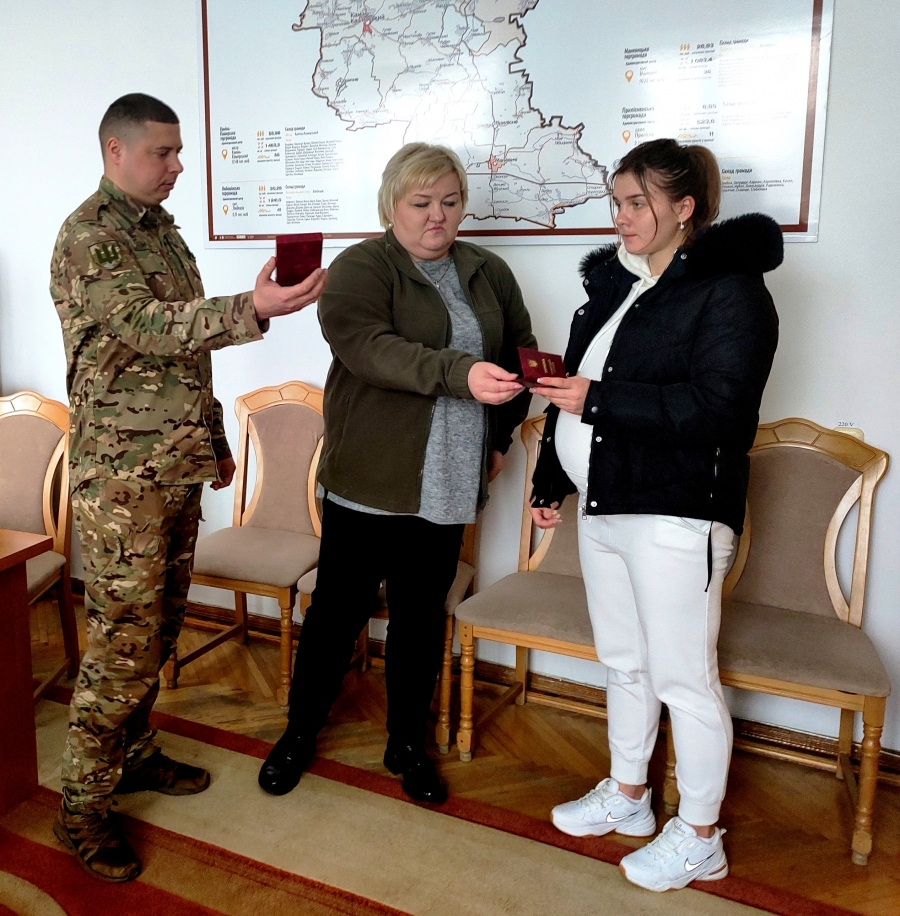 Сьогодні, 3 квітня, начальниця Камінь-Каширської районної військової адміністрації Ольга Ващук спільно з міським головою Віктором Пасем і в. о. начальника Камінь-Каширського районного територіального центру комплектації та соціальної підтримки Валентином Борухом вручили державну відзнаку доньці загиблого захисника України Валентина Карпіка з Підріччя (Камінь-Каширська ТГ).