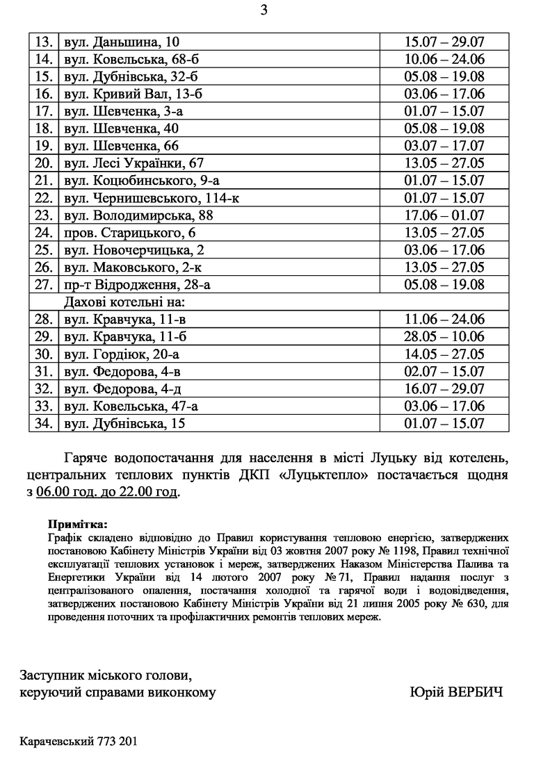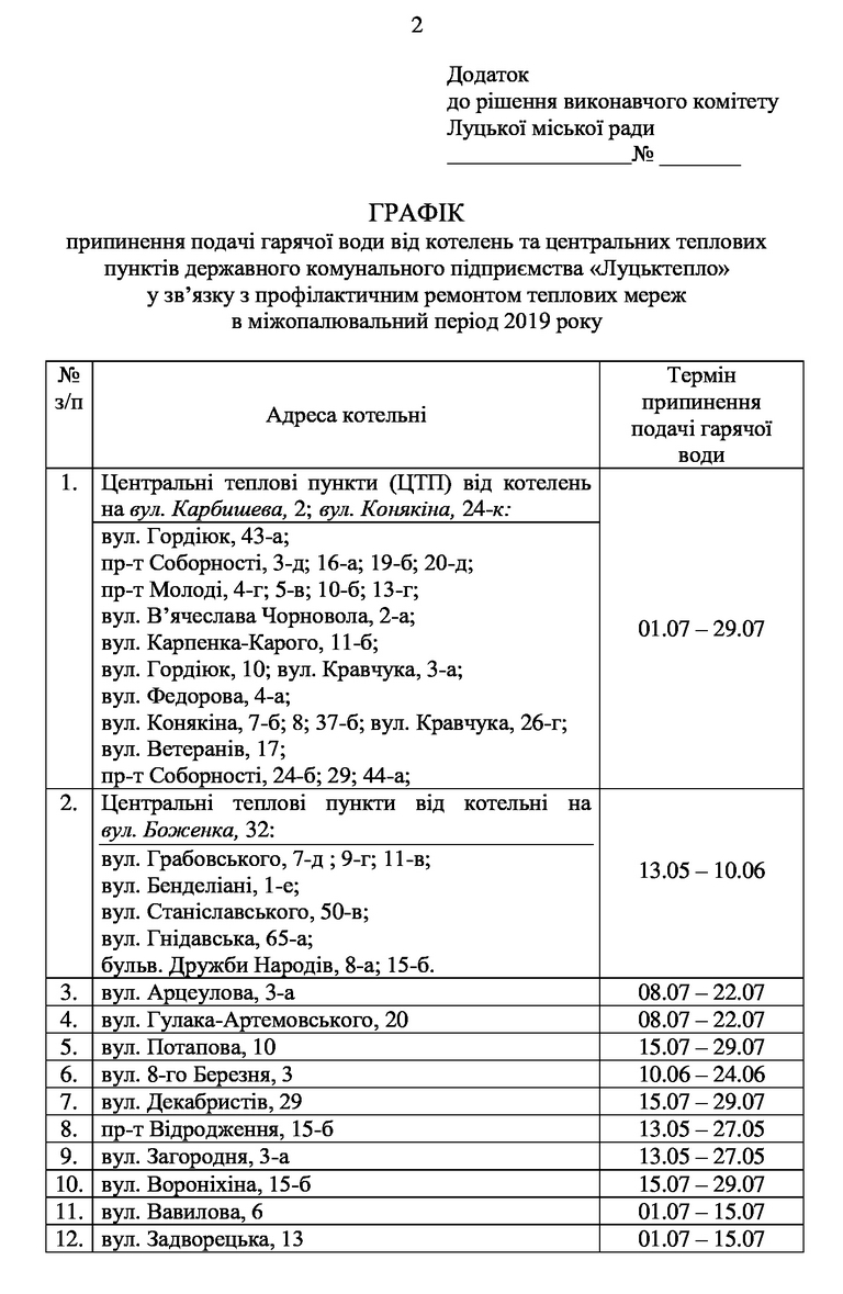 Члени виконкому зобов’язали державне комунальне підприємство «Луцьктепло» дотримуватись графіка при умові надання послуги з централізованого постачання гарячої води в міжопалювальний період 2019 року.