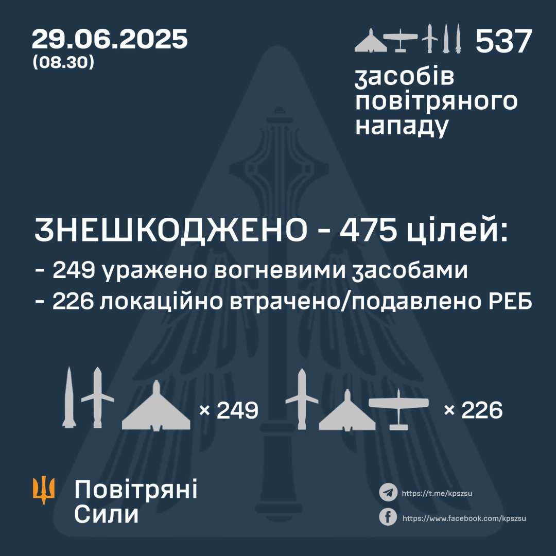 У ніч на 29 червня (із 19:00 28 червня) ворог атакував 537 засобами повітряного нападу: