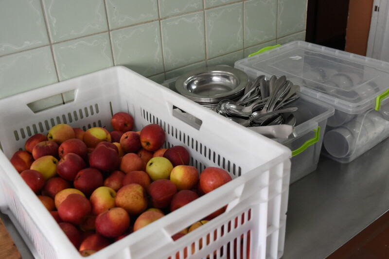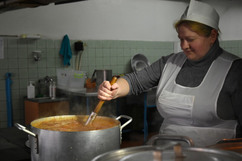 Валентина Галкіна та семеро її колег по кухні працюють над «солдатськими» обідами від п’ятої ранку. Кажуть – так наближають перемогу над російським окупантом. Сьогодні у меню: каша, котлета, салат, борщ і обов’язково — здоба.