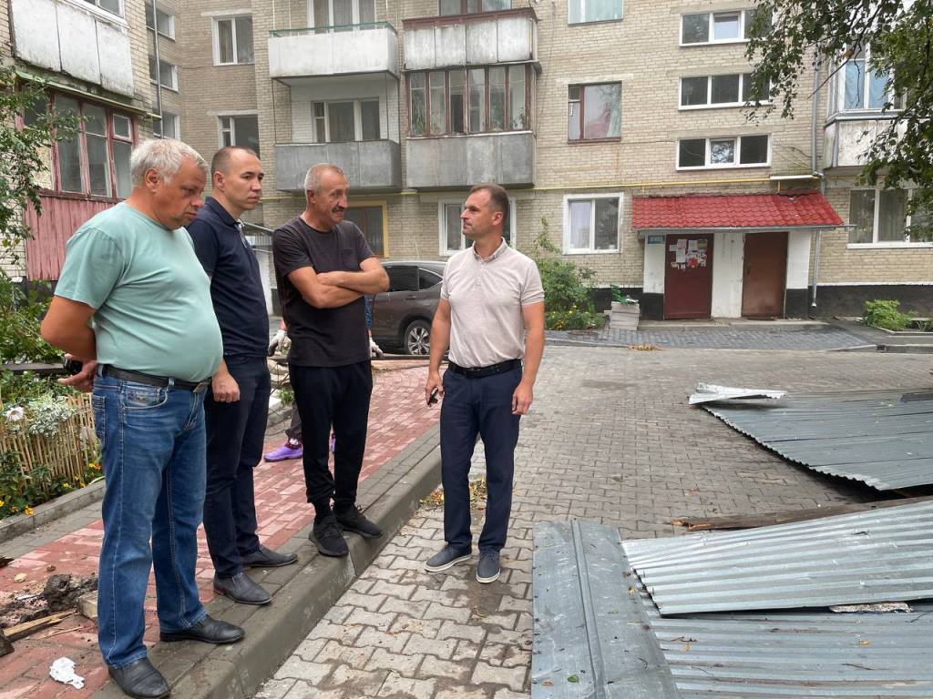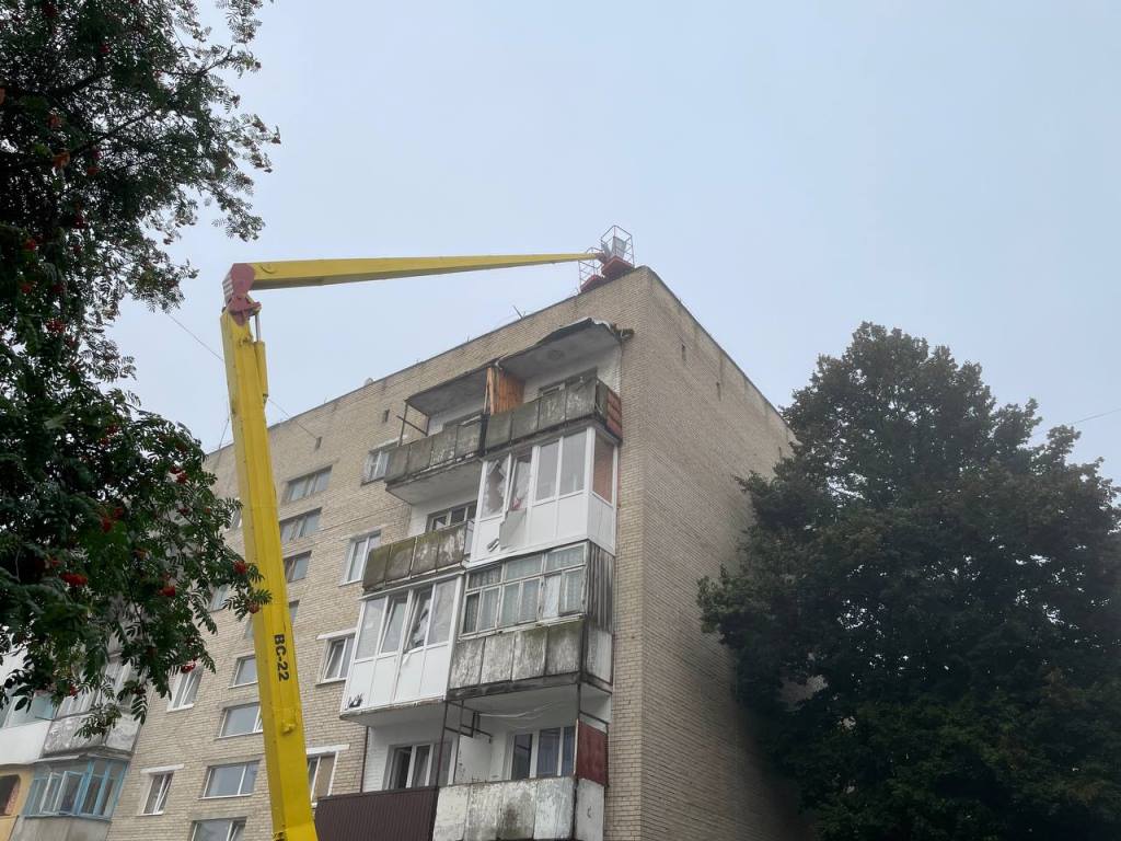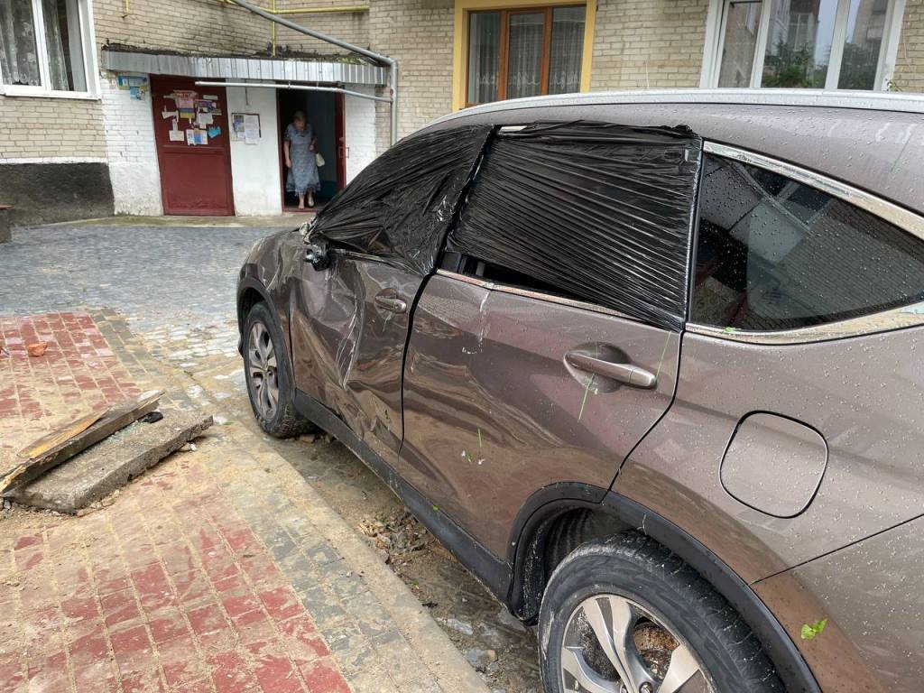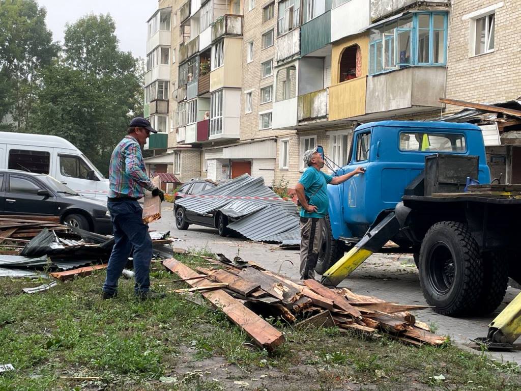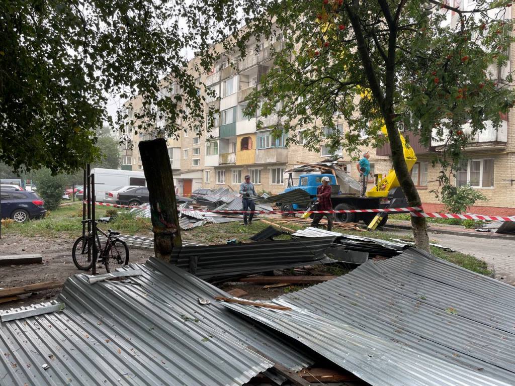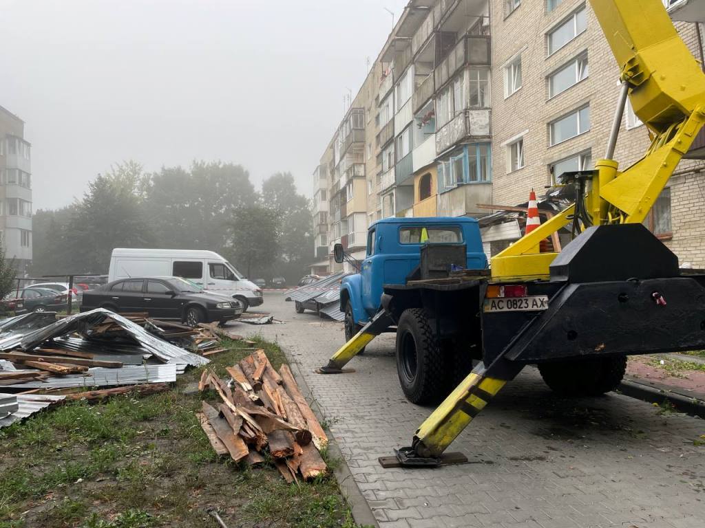 Зірвані вітром металеві листи та дерев’яне перекриття потрощило припарковані автівки та балкони сусіднього будинку № 102. Від самого ранку 20 серпня у дворі багатоповерхівок почали працювати комунальні служби. Побував на місці й Володимирський міський голова Ігор Пальонка.
